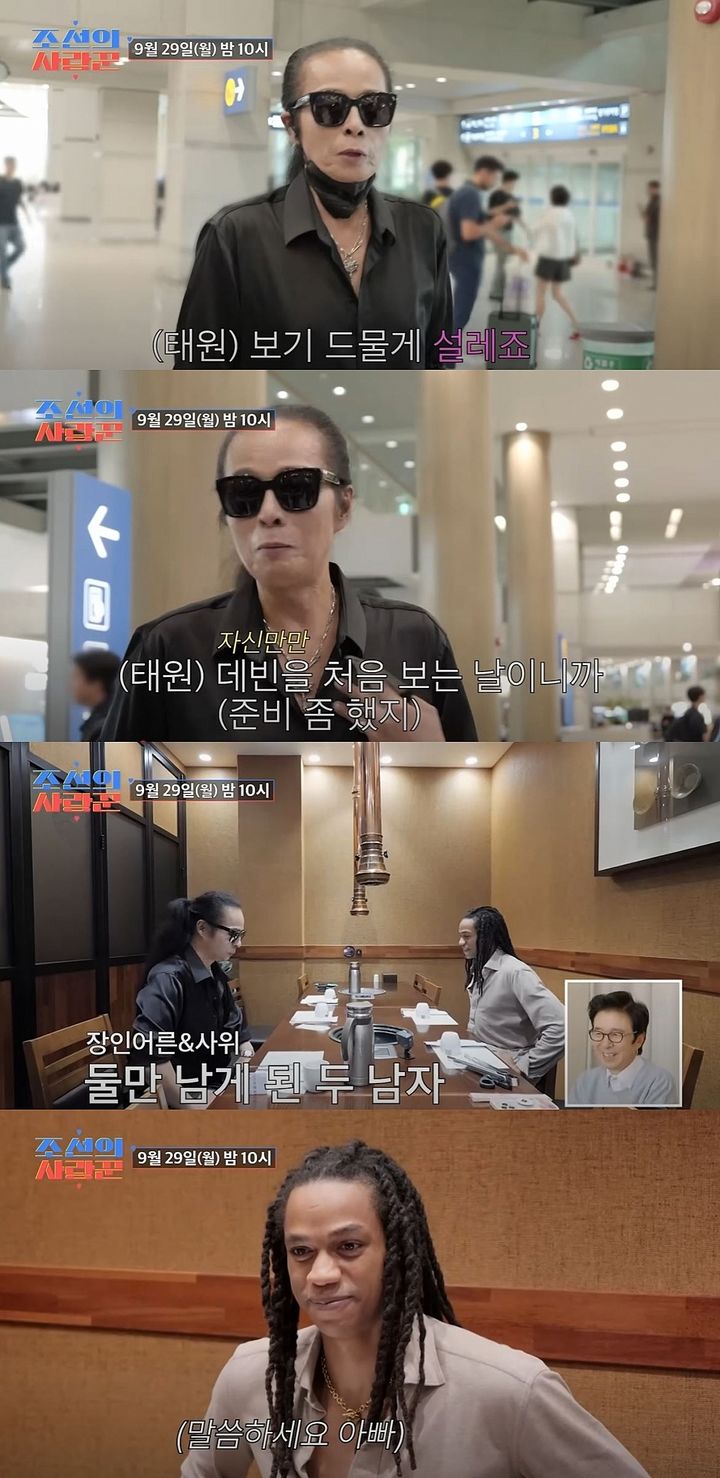 [서울=뉴시스]가수김태원이29일방송하는TV조선예능프로그램'조선의사랑꾼'에서뉴욕사위데빈과한국에서처음만난다.(사진=TV조선'조선의사랑꾼'캡처)[email protected]*재판매및DB금지[서울=뉴시스]신지아인턴기자=가수김태원이미국인사위를처음만나고당황한다.그는29일방송하는TV조선예능프로그램'조선의사랑꾼'에서뉴욕사위데빈과한국에서처음만난다.제작진이"기분이어떠시냐"고묻자김태원은"이렇게쉽게설레는사람이아닌데보기드물게설렌다"고한다.김태원은영어공부는했냐는질문에"데빈을처음보는날이니까(준비했다)"고답한다.그는어리숙하게영어를하며"중학교때영어인가"라고말한다.이후김태원은사위와식당에서마주앉아"내가말을진짜잘하는사람이다"라고한다.그는사위에게영어와몸짓을섞어말하고,데빈은어색한미소를짓는다.한편김태원은과거두차례대마초흡연으로적발된적있다.그는딸결혼식참석을위해미국행을준비했지만,전과로입국이거부됐다.☞공감언론뉴시스[email protected]©뉴시스.무단전재및재배포금지.