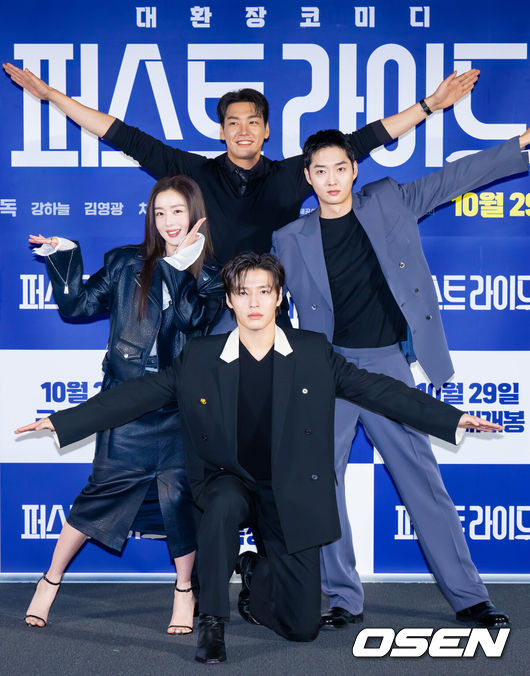 [OSEN=박준형기자]25일오전서울용산아이파크몰내용산CGV에서영화'퍼스트라이드'제작보고회가진행됐다.영화‘30일’의남대중감독의신작으로기대를모영화‘퍼스트라이드’는끝을보는놈태정(강하늘),해맑은놈도진(김영광),잘생긴놈연민(차은우),눈뜨고자는놈금복(강영석),사랑스러운놈옥심(한선화)까지뭉치면더웃긴24년지기친구들이첫해외여행을떠나는코미디다.배우강하늘과김영광,강영석,한선화가포즈를취하고있다.2025.09.25/[email protected][OSEN=유수연기자]대환장케미,대환장코미디'퍼스트라이드'가이륙준비에나섰다.25일CGV용산아이파크몰에서는영화‘퍼스트라이드’(감독남대중,제공배급㈜쇼박스,제작브레인샤워·티에이치스토리)제작보고회가진행됐다.행사에는강하늘,김영광,강영석,한선화,남대중감독이참석했다.영화'퍼스트라이드'는끝을보는놈태정(강하늘),해맑은놈도진(김영광),잘생긴놈연민(차은우),눈뜨고자는놈금복(강영석),사랑스러운놈옥심(한선화)까지뭉치면더웃긴24년지기친구들이첫해외여행을떠나는코미디작품.[OSEN=박준형기자]25일오전서울용산아이파크몰내용산CGV에서영화'퍼스트라이드'제작보고회가진행됐다.영화‘30일’의남대중감독의신작으로기대를모영화‘퍼스트라이드’는끝을보는놈태정(강하늘),해맑은놈도진(김영광),잘생긴놈연민(차은우),눈뜨고자는놈금복(강영석),사랑스러운놈옥심(한선화)까지뭉치면더웃긴24년지기친구들이첫해외여행을떠나는코미디다.남대중감독이질문을듣고있다..2025.09.25/[email protected]이날연출을맡은남대중감독은캐스팅비하인드에대해“모두훌륭하고멋진배우들이라,저뿐만이아니라모든감독님이하고싶은배우들아닌가.일단강하늘배우는‘30일’을함께해보지않았나.제가쓰고연출하는작품을가장맛있게표현해줄수있는배우라생각했다.아니나다를까,제생각이상으로센스가너무좋더라.이영화는강하늘배우없으면어떡할뻔했나,할정도로해주셨다.다행히하늘배우가흔쾌히받아주셔서감사했다.하늘배우에게현장에서막바지에한말이있다.‘내가앞으로얼마나작품할지모르겠지만,너하고만해도되겠다’했었다"라고말했다.이어"김영광배우는,도진이가복합적인캐릭터다.때로는과묵하고멋있기도했다가,어떨때는바보같고,순수한모습도보인다.일단비주얼적으로영광배우는멋있지않나.말을없을땐멋있다가도,웃으면소년미가있다.어떨땐좀바보같을때도있는매력이있어서프로포즈를했는데,흔쾌히선택해주셔서감사했다.영광배우가안했다면극캐릭터가바뀌어야했을정도였다"라며"강영석배우는오디션을통해뽑았는데,이미그전에연기력으로는논할필요도없이너무잘하는배우라는걸알고있었다.가장큰이유는눈빛과두상이었다.농담이고,연기톤이제가추구하는코미디와잘맞았고,마지막오디션에는머리를아예밀고왔더라.봤는데두상이너무완벽하더라.여드름도하나없고.완벽한알전구같은.남자는머리빨인데,어떻게강영석배우는삭발했는데저렇게귀엽고잘생겼나,할정도로완벽했다"라고전했다.[OSEN=박준형기자]25일오전서울용산아이파크몰내용산CGV에서영화'퍼스트라이드'제작보고회가진행됐다.영화‘30일’의남대중감독의신작으로기대를모영화‘퍼스트라이드’는끝을보는놈태정(강하늘),해맑은놈도진(김영광),잘생긴놈연민(차은우),눈뜨고자는놈금복(강영석),사랑스러운놈옥심(한선화)까지뭉치면더웃긴24년지기친구들이첫해외여행을떠나는코미디다.배우강하늘이추천하고싶은연예인질문에답하고있다.2025.09.25/[email protected]더불어"한선화배우는개인적으로옥심캐릭터를가장좋아한다.옥심이가네명의바보들을잘이끌고,올바른길로인도해야하는캐릭터이기도하고.겉으론들어나진않지만모든캐릭터의정점에서있다.그렇기때문에,배우자체가가진독보적인아우라나존재감이있는배우를떠올렸고,그게한선화배우라생각했다.촬영을마치고편집본을보니,선택이틀리지않음을스스로증명해주셔서감사드린다.감히말씀드리면,이영화에서가장잘한다섯가지중하나한선화배우캐스팅인거같다"라며"차은우배우는열심히나라를위해국방의의무를하고있는데,캐스팅경우도,차은우배우가아니면개연성이성립하지않은캐릭터다.이걸선택해주지않았다면캐릭터를바꾼다던가,제대기다리고찍어야할정도로찰떡이었다.때마침배우본인도또래나형들,친구들과코미디연기하고싶다는니즈가잘맞은거같아감사하다.조상님이주신복이아닐까싶다"라고전했다.강하늘은수능만점에이어,국회의원보좌관자리까지꿰찬정태정역을을맡았다.강하늘은'30일'에이어감독과재회하게된소감에대해"‘30일’도너무좋았는데,짧은시간에다시만났던감독님이없던거같다.이렇게만나나훨씬더좋더라.감독님도제가어떤스타일이어떤지알다보니,긴이야기가필요하지않았다.편하고,훨씬더재미있었다.또감독님이작품이잘되시지않았나.그이후에더재미있어졌다.자신감과여유가생기셨다.그래서너무편했다"라며호흡을전했다.[OSEN=박준형기자]25일오전서울용산아이파크몰내용산CGV에서영화'퍼스트라이드'제작보고회가진행됐다.영화‘30일’의남대중감독의신작으로기대를모영화‘퍼스트라이드’는끝을보
