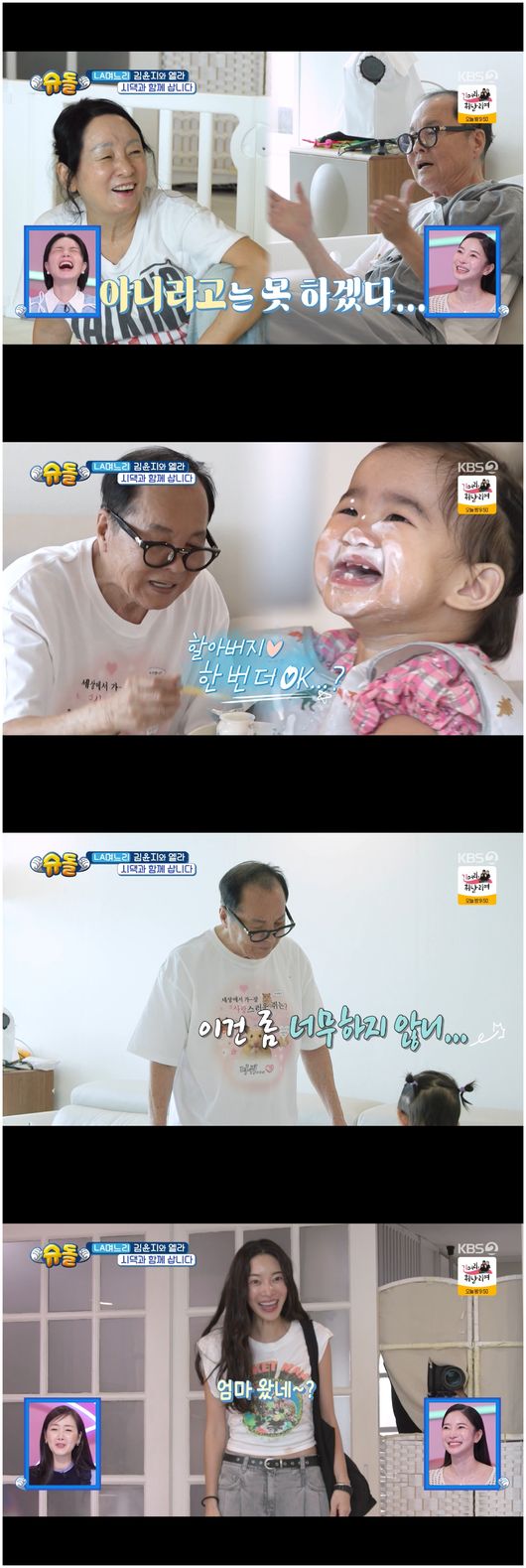 [OSEN=오세진기자]‘슈퍼맨이돌아왔다’가수겸배우김윤지가시아버지이상해와시어머니김영임에게육아를부탁했다.17일방영한KBS2TV예능‘슈퍼맨이돌아왔다’(이하‘슈돌’)에서는LA며느리타이틀을단김윤지가등장했다.넷플릭스시리즈‘리프트’주인공으로우뚝선김윤지는이날글로벌패션브랜드화보촬영스케줄이있어오후에육아를부탁해야하는상황이었다.그러나아침에는여유롭게딸엘라와산책을한김윤지는익숙하게9층시부모님댁으로향했다.김윤지는“비밀번호공유는필수다”라면서자연스럽게비밀번호를누르고갔다.안영미는“시댁에도아기용품이많다”라며단박에알아차렸고김윤지는“정말자주가니까요”라며웃었다.김윤지는시부모에게아이식사를부탁한후자신은시어머니가요리한갈비찜과미역국을푸지게먹으며한강뷰를감상했다.또한김윤지는시어머니김영임이랑옷이야기를하며시시콜콜한대화를이어나갔다.김윤지는“시어머니랑옷장을공유한다.너무좋다.옷이그만큼더많은걸입을수있다”라면서“어머니는정말힙하시고오버사이즈옷을좋아하신다.서로옷을고민한다”라고말해'딸같은며느리'의정석을보였다.이어시댁냉장고를열어보며보리차를찾던김윤지는“제가보리차를좋아해서어머니께서보리차를끓여두신다”라면서“지금은진짜가족이됐지만,원래도가족같이지냈다.원래시부모님께결혼전에큰엄마,큰아빠이렇게불렀다”라며흐뭇하게웃었다.김윤지는스케줄때문에아이를맡겨야했다.김윤지는“제가스케줄이있는데어머님이랑아버님이좀봐주실수있냐”라고물었고그러자이상해는“엘라일이라면두손다놓고뛰어갈수있다!”라며당연하다는듯버럭소리를질러김윤지를웃게만들었다.김윤지가한창화보촬영에집중하는그시각이상해는슬랩스틱의대가로서아이를웃게하기위해이상한모자를쓰며몸을움직였다.아이미끄럼틀에서몸을굴리는건물론비니를쓴채"요새애들힙합을어떻게하는거지?"라며일명서태지춤까지춰보여모두를깜짝놀라게했다.엘라는웃으면서도돌연웃음을멈췄다가할아버지가마련해준요구르트놀이에격렬하게움직이기도했다.이상해는“이건좀너무하지않니?”라고말하다“할아버지가책임질게,해라”라면서지쳐보이는표정이됐다.그는곧“애가왜이러지?”라고말해웃음을안겼다.돌아온김윤지는“고생하셨죠?아버님,Areyouokey?”라며조심스럽게물었고이상해는“무슨Areyouokey냐”라며육아에지친모습을보였다.김윤지는시부모님에게고마운마음이들었다.거기다이상해가그렇게까지몸을움직일줄몰랐다.김윤지는그래서진심을다해시부모님의저녁을차려드리고싶었으나김영임과이상해는“아니,아니,집에가서먹을게”라며단칼에거절해웃음을안겼다./[email protected][사진출처]KBS2TV예능‘슈퍼맨이돌아왔다’Copyright©OSEN.무단전재및재배포금지.