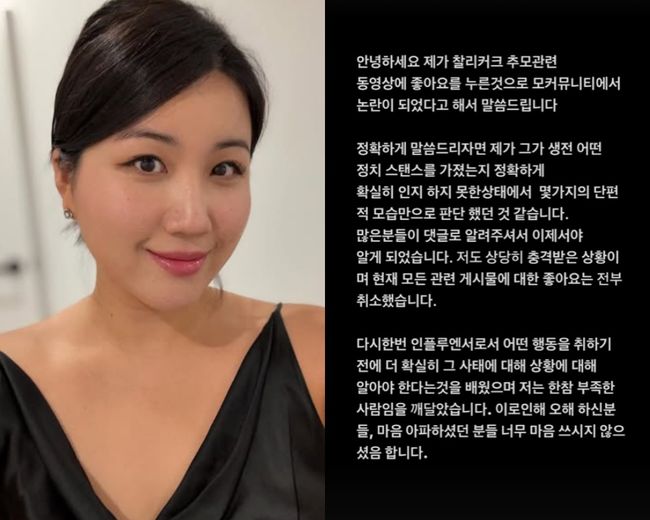 [OSEN=연휘선기자]인플루언서해쭈가피격사망한찰리커크의추모콘텐츠에'좋아요'를누른일에대해해명하고사과했다.해쭈는13일새벽개인SNS에장문의해명글을게재했다.1차해명글에서그는먼저"제가찰리커크추모관련동영상에좋아요를누른것으로모커뮤니티에서논란이되었다고해서말씀드린다"라고운을뗐다.이어"그가생전어떤정치스탠스를가졌는지정확하게확실히인지하지못한상태에서몇가지의단편적모습만으로판단했다"라고밝혔다.그는"많은분들이댓글로알려주셔서이제서야알았다"라며"저도상당히충격받은상황이며현재모든관련게시물에대한좋아요는전부취소했다"라고강조했다.이어"다시한번인플루엔서로서어떤행동을취하기전에더확실히그사태에대해상황에대해알아야한다는것을배웠으며저는한참부족한사람임을깨달았다"라고강조했다.더불어그는"제가정말무지했다.진심으로죄송했다"라고짧게나마사과글을덧붙였다.해쭈는개인유튜브채널에약84만명의구독자를거느린인플루언서다.개인유튜브채널과SNS를통해구독자들과소통하며화제를모으고있다.이가운데지난10일(현지시각)피격사망한찰리커크의추모영상들에'좋아요'를누른일로비판여론에휩싸였다.찰리커크는도널드트럼프미국대통령의최측근으로,미국에서극우성향의정치평론가로알려졌다.특히그는생전미국의총기사망사건과관련해"매년일부희생이따르더라도수정헌법2조를지키기위해감수할합리적대가"라며희생자들을경시하는발언을해강한비판을받아왔다.다음은해쭈의해명문및사과글전문이다.안녕하세요제가찰리커크추모관련동영상에좋아요를누른것으로모커뮤니티에서논란이되었다고해서말씀드립니다정확하게말씀드리자면제가그가생전어떤정치스탠스를가졌는지정확하게확실히인지하지못한상태에서몇가지의단편적모습만으로판단했던것같습니다.많은분들이댓글로알려주셔서이제서야알게되었습니다.저도상당히충격받은상황이며현재모든관련게시물에대한좋아요는전부취소했습니다.다시한번인플루엔서로서어떤행동을취하기전에더확실히그사태에대해상황에대해알아야한다는것을배웠으며저는한참부족한사람임을깨달았습니다.이로인해오해하신분들,마음아파하셨던분들너무마음쓰시지않으셨음합니다.제가정말무지했습니다.진심으로죄송했습니다./[email protected][사진]SNS출처.Copyright©OSEN.무단전재및재배포금지.