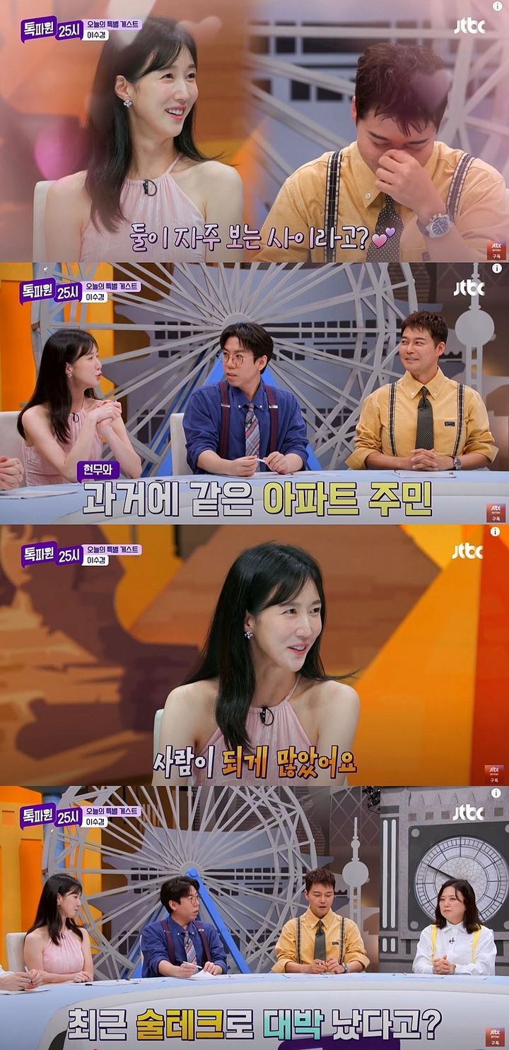 [서울=뉴시스]배우이수경이지난1일방송한JTBC예능프로그램'톡파원25시'에게스트로출연했다.(사진=JTBC'톡파원25시'캡처)[email protected]*재판매및DB금지[서울=뉴시스]신지아인턴기자=배우이수경이방송인전현무와자주봤던사이라고말했다.그는지난1일방송한JTBC예능프로그램'톡파원25시'에게스트로출연했다.오프닝에서김숙이"전현무와한때자주봤던사이였냐"고하자이수경은"옛날에같은아파트에살아서이웃주민이었다"고답했다.이수경은"만나서밥도먹고차도마셨다"고덧붙였다.이에김숙이"단둘이서만그랬냐"고묻자이수경은"사람이되게많았다"고했다.전현무는"모임이름이'금이야옥이야'였다"며"금호동,옥수동모여라라는뜻"이라고말했다.이수경은최근'술테크'로대박이났다는기사에대해"원래마시려고샀던술가격이10배로비싸졌다"고했다.그는"나중에정말좋을때먹으려고그냥놔두고있다"고말했다.☞공감언론뉴시스[email protected]©뉴시스.무단전재및재배포금지.