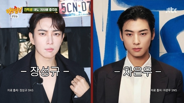 JTBC‘아는형님’캡처JTBC‘아는형님’캡처[뉴스엔서유나기자]아나운서출신방송인장성규가메이크업아티스트이사배의손에가수겸배우차은우로변신했다.8월30일방송된JTBC예능'아는형님'(이하'아형')497회에서는궤도,충주맨김선태,이사배가형님학교로전학을왔다.이날이사배는메이크업해준수많은스타중가장기억에남는사람으로장성규를꼽았다."장성규님은차은우님으로메이크업해드린적있다"고.형님들은장성규가"키도크고잘생겼다"고칭찬하면서도"차은우는상상안된다"며술렁거렸고,이사배는"나도처음에상상안됐다"고밝혔다.차은우메이크업을받은장성규사진이공개됐다.이에신동과김희철은차은우가아니라"김똘똘아냐?"라고말해웃음을자아냈다.이상민은"대단하다"고인정했다.뉴스엔서유나stranger77@기사제보및보도자료[email protected]ⓒ뉴스엔.무단전재&재배포금지Copyright©뉴스엔.무단전재및재배포금지.