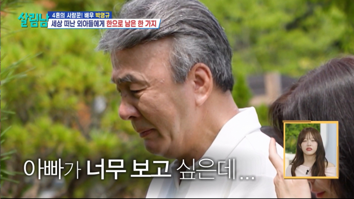 ‘4혼’배우박영규가가족들과함께아들을만나러갔다.iMBC연예뉴스사진8월30일방송된KBS2TV‘살림하는남자들시즌2’(약칭‘살림남’)에서는박영규가아내,딸과함께21년전세상을떠난아들을만나러간모습이공개됐다.이날박영규는평상시와달리밤잠까지설치는모습을보였다.불의의교통사고로잃은외아들에대한미안한마음때문인것.아내는“짠한마음이들었다”라며안타까워했다.iMBC연예뉴스사진iMBC연예뉴스사진이후박영규는아내의제안에따라다함께아들이있는수목장으로향했다.그는“셋이같이갈수있어서행복하다.작년엔혼자갔는데허전하고그랬다”라며솔직한심정을전했다.박영규는아들의나무앞에서“너무보고싶은데”라며왈칵눈물을쏟아냈다.이어“네예쁜동생이다.잘지켜봐달라”라며딸을소개했다.또한,그는아들이좋아했던떡볶이를직접준비한아내에게고마운마음을표했다.iMBC연예뉴스사진iMBC연예뉴스사진한편,스타살림남들의리얼살림기를담은프로그램‘살림하는남자들시즌2’는매주토요일오후10시20분에방송된다.iMBC연예김혜영|사진출처KBSCopyright©MBC연예.무단전재및재배포,AI학습금지.