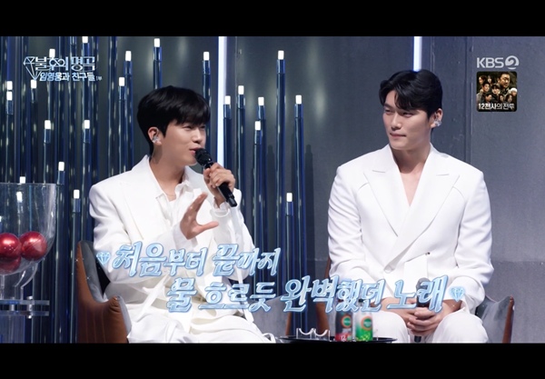 ⓒKBS2[스포츠한국이유민기자]가수임영웅이후배전종혁을두고'인성테스트'를했다고솔직히밝혀현장을웃음바다로만들었다.30일방송된KBS2예능'불후의명곡–임영웅과친구들'편에서는임영웅과전종혁의특별한인연이공개됐다.임영웅은"전종혁의인성을알아보기위해한달동안주기적으로회식을했다.끝까지자리에남아있나,중간에빠져나가나를지켜봤다"며웃음을자아냈다.이에전종혁은"그동안인성테스트가뭔지궁금했는데이제알겠다.드디어의문이풀렸다"며너스레를떨어현장을폭소케했다.ⓒKBS2이어두사람의만남비하인드도공개됐다.축구광으로유명한임영웅은직접FC를창단해구단주로활동중인데,전종혁이전직축구선수출신으로뛰어난실력을보여꼭영입하고싶었다고설명했다.임영웅은녹화현장에서고난도드리블기술을직접선보이며운동실력을뽐내기도했다.ⓒKBS2무대에서는두사람의'특급호흡'이이어졌다.임영웅과전종혁은합동으로'별빛같은나의사랑아'를불러호소력짙은보컬을선사했다.객석을가득메운영웅시대팬들은응원봉을흔들며열띤호응을보냈고,두사람의절절한하모니는팬들에게잊지못할귀호강무대를안겼다.ⓒKBS2한편,전종혁은초등학교시절부터성남FC유소년팀에서성장했으며,풍생중·풍생고시절주전골키퍼로활약하며해당연령대최고의수문장으로이름을알렸다.축구무대에서두각을드러낸전종혁은은퇴이후가수로변신했다.MBN오디션프로그램'불타는트롯맨'에도전해준결승까지오르는저력을보여줬으며,최종12위로경연을마무리했다.이후KBS2교양프로그램'아침마당'에출연해7연승을기록하며시청자들의큰사랑을받았다.ⓒKBS2스포츠한국이유민기자[email protected]©스포츠한국.무단전재및재배포금지.