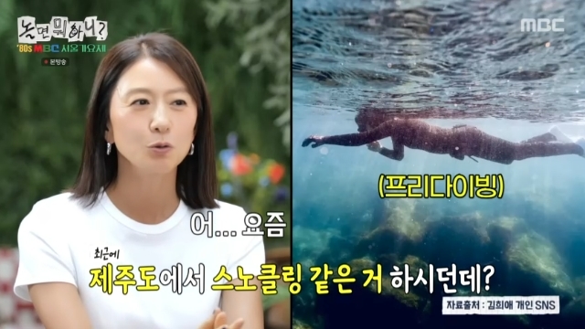 MBC‘놀면뭐하니?’캡처MBC‘놀면뭐하니?’캡처[뉴스엔서유나기자]배우김희애가프리다이빙에빠진근황을전했다.8월30일방송된MBC예능'놀면뭐하니?'(이하'놀뭐')295회에서는배우김희애가'80sMBC서울가요제'특집의특급게스트로출격했다.이날가요제MC섭외를위해나선유재석,하하는배우김희애와접촉했다.'무한도전'이후9년만에김희애와재회한유재석,하하는그녀의여전한아름다운미모에감탄을거듭했다.유재석이"오늘제주도에서오셨냐"고묻자김희애는"며칠전에왔다"고답했다."제주살이하시는거냐"는말엔"반반씩"이라고밝혔다.유재석은"제주도에서스노클링하시고그러시던데"라며최근김희애가프리다이빙에빠진근황을언급했다.김희애는"요즘행복하게보내보려고노력중이다.(프리다이빙을시작한건)작년부터다.물이무서워서시작한거다.바보같이더나이들면못하는데죽기밖에더하겠냐했는데지금도많이못들어가는데그래도행복하다.외국여행간것같다.외국가면이국적인느낌이좋잖나.바닷속이이국적이다.못보던생명체가보이니까되게신기하고웃음이난다.'내가무서워서못들어왔던세계구나'하고"라고말했다.유재석과하하는김희애의햇볕에그을린피부에"멋있다.이태리사시는분의피부다.패션도그렇다"고평했다.한편김희애는1967년4월생으로만58세다.뉴스엔서유나stranger77@기사제보및보도자료[email protected]ⓒ뉴스엔.무단전재&재배포금지Copyright©뉴스엔.무단전재및재배포금지.