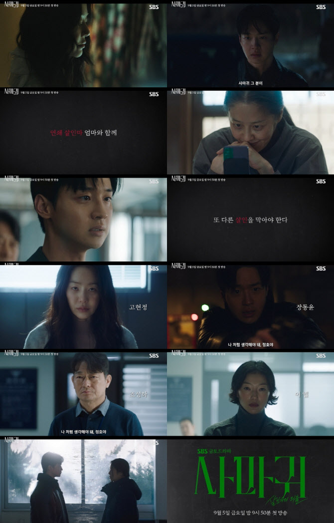 SBS'사마귀:살인자의외출'변영주감독연출[이데일리스타in최희재기자]‘사마귀:살인자의외출’고현정과장동윤이섬뜩한모자(母子)호흡을선보인다.(사진=SBS)오는9월5일첫방송되는SBS새금토드라마‘사마귀:살인자의외출’(사마귀)은잔혹한연쇄살인마‘사마귀’가잡힌지20여년이지나모방범죄가발생하고,이사건해결을위해한형사가평생증오한‘사마귀’인엄마와예상못한공조수사를펼치며벌어지는고밀도범죄스릴러다.25일공개된3차티저영상에는연쇄살인마가된정이신(고현정분)과강렬한카리스마를장착한차수열(장동윤분)의파격적인투샷이담겨있다.‘또다른살인을막기위해연쇄살인마엄마와손을잡는아들’이라는두주인공의관계성과주요스토리까지임팩트있게보여주며예비시청자들의호기심과기대감을끌어올린다.3차티저는정이신의섬찟한뒷모습으로시작된다.그녀가저지른20년전희대살인사건이암시된가운데“짐승같은그애애비를죽인거야,사마귀그분이”라는광기로떨리는정체불명의목소리가들려와궁금증을유발한다.잠시후살인사건이발생한듯차수열을비롯한경찰들은치열하게수사에몰두한다.이때“사마귀를찬양하는모방범죄”라는카피가등장해눈길을끈다.이어연쇄살인마엄마정이신이다시등장한다.첫화면속앳된모습과는사뭇다른,초췌하고파리하게변한그녀는“날똑같이따라했다며?”라며기괴한표정으로사건현장을샅샅이살핀다.급기야“피한방울안흘리고잡을생각하지마세요”라며섬뜩한말을내뱉는다.그런정이신의잔혹함에아들차수열의표정과눈빛이한없이흔들려눈길을끈다.반면정이신은차수열에게흔들림없이“나처럼생각해야돼.정호야”라고말한다.‘수열아’가아닌‘정호야’라고말한이유는무엇일지궁금증을자아낸다.결국연쇄살인마엄마정이신과형사아들차수열이마주선다.차수열의“어쩔까요?죽일까요?”라고묻는다.이물음의의미는무엇일까.또다른살인을막기위해평생증오한연쇄살인마엄마정이신과손을잡아야하는형사아들차수열의진심은무엇일까.‘사마귀’는오는9월5일오후9시50분첫방송된다.최희재([email protected])Copyright©이데일리.무단전재및재배포금지.