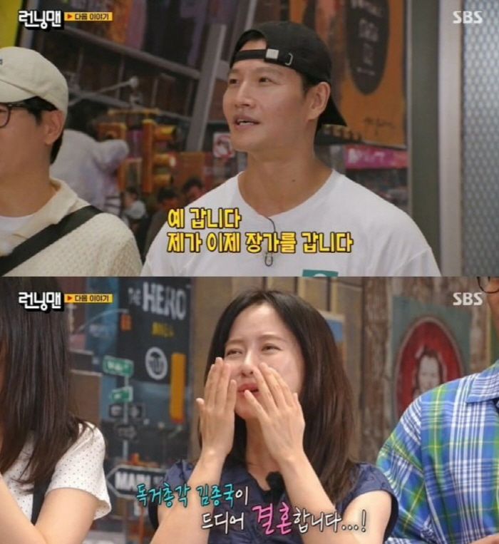 [스포츠조선조민정기자]배우송지효가절친김종국의결혼소식에결국눈물을터뜨렸다.지난24일방송된SBS예능'런닝맨'에서는런닝체대상품대첩레이스가진행됐다.이날김종국은오프닝전멤버들을따로불러깜짝결혼소식을전했고,예상치못한고백에멤버들은"너무좋다,진짜야뭐야"라며놀라움을감추지못했다.특히송지효는눈시울을붉히며"나지금약간감동받았다"라고말해시선을모았다.김종국은카메라를향해"내가장가를간다.열심히잘살겠다"라며정식으로결혼을발표했다.멤버들은"아직도안믿긴다","말도안된다"라며환호했고현장은축하의박수로가득찼다.유재석은"지효우는거냐"라며송지효의눈가를짚어주기도했다.이어멤버들은"예전에태어났으면독립군을했어야한다.입을다물고직전까지아무말도안했다.독립투사다"라며철저히비밀을지켜온김종국을두고농담을던져웃음을자아냈다.또한이날미션에서런닝볼추첨에당첨된이는다름아닌김종국과송지효였다.지석진은"저둘은15년째운이좋은것같다"라며놀라워했고,송지효는김종국에게하이파이브를요청했지만김종국이시큰둥한반응을보이자"왜(나)싫어하냐"고말해웃음을더했다.김종국은"내가언제싫어했냐.나나오는줄알았다"고해명했다.한편김종국은지난18일팬카페를통해"나장가간다"라며결혼을공식발표했다.그는오는9월5일서울모처에서비공개결혼식을올릴예정이다.조민정기자[email protected]©스포츠조선.무단전재및재배포금지.