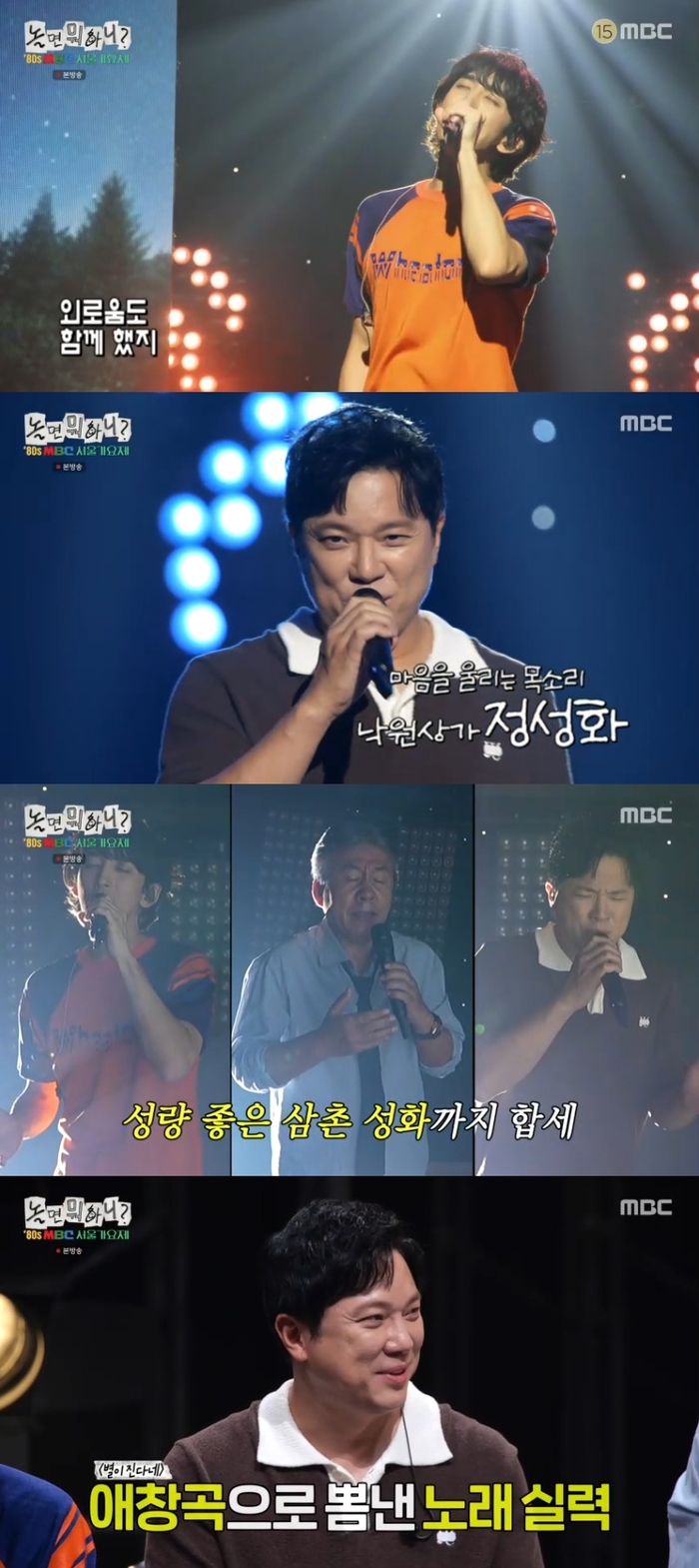 ‘놀면뭐하니’.사진IMBC남산타워,잠수교,낙원상가의정체가공개됐다.23일오후방송된MBC예능프로그램‘놀면뭐하니?’(연출김진용장우성장효종왕종석,작가최혜정)에서남산타워,잠수교,낙원상가가‘친구여’를열창했다.이날방송에서남산타워는박영규,잠수교는최정훈,낙원상가는정성화로밝혀졌다.유재석은“박영규형님은어떡할까고민했는데열정이있어서‘인생은원씬,원컷트!’라고해서(합격시켜드렸다)”며합격이유를말했다.뮤지컬계의영웅배우정성화는“‘별이진다네’가90년대노래인줄알았다”면서“80년대노래를듣고자랐어요.잘아는노래는잘부르고싶은거예요.연습도많이하고했는데막상부르니까너무떨리더라고”라고말했다.멤버들의극찬을들은최정훈은“저번에MSG워너비오디션은너무힘주고불러서떨어졌어요.이번에는80년대취지에맞게감성을중심으로연습했다”며“저도부르는내내이렇게팀을하면좋겠다고생각했다”며박영규,정성화와함께한무대가좋았다고했다.MBC‘놀면뭐하니?’는매주토요일오후6시30분방송된다.[서예지스타투데이객원기자]Copyright©스타투데이.무단전재,재배포및AI학습이용금지