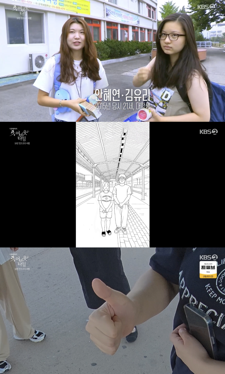[스타뉴스|정은채기자]/사진='다큐3일'방송화면캡쳐KBS'다큐3일'제작진이10년전안동역에서맺은약속을끝내지켜냈다.그리고그순간을증명하는인증샷이공개되며시청자들의마음을뜨겁게만들었다.22일방송된KBS2TV'다큐멘터리3일특별판-어바웃타임:10년전으로의여행72시간'에서는"2025년8월15일에만나자"라는여대생의제안에새끼손가락을걸었던촬영감독이지원VJ가실제로약속장소를찾는모습이담겼다.이지원VJ는"아무도안올까봐,바람맞은아저씨될까봐걱정을살짝했는데…나라도약속을지켜야지,낭만을지키러가야지"라며떨리는속마음을고백했다.그러나현장은돌발상황으로긴장감이감돌았다.안동역광장에폭발물을설치했다는협박이접수돼경찰이긴급출동했고,제작진은철수해야했던것.순간약속은무산되는듯보였다.하지만기적처럼7시48분정각,한여성이"제가약속당사자입니다"라며다가왔다.제작진은본인요청에따라카메라를껐고,대신화면에는당시대학생유리씨가엄지척을한손사진이공개됐다.이어이지원VJ와유리씨가안동역플랫폼에서나란히서있는투샷인증샷이삽화형식으로등장하며시청자들의눈시울을적셨다.폭발물협박속지켜낸낭만..'다큐3일'안동역인증샷공개[★밤TV]비록대피요청으로멀리떨어져야했지만,두사람은정확히10년만에약속을지켜냈다.이지원VJ는"첫마디가'잘살았어요?'였다.서로'잘살아줘서고맙다'는말을주고받았다.약속이대국민적인관심사가돼서부담이컸는데,그친구도,나도끝까지기억하고있었더라.약속이라는게시간이갈수록더무거워졌다고했다.스스로낭만을지켰다는뿌듯함이있다.너무나좋다"고소회를밝혔다.방송말미에는유리씨가직접보낸장문의메시지가공개돼또한번의감동을전했다.반면함께약속했던또다른학생혜연씨는해외에있어현장에는오지못했지만,"멀리서모든순간을지켜봤다"며마음을전했다.2015년'다큐3일'안동역편에서시작된작은약속은,10년의세월을넘어결국지켜졌다.그리고무엇보다,엄지척과투샷으로남겨진인증샷은그낭만의순간을영원히기록했다.정은채기자[email protected]©스타뉴스&starnewskorea.com,무단전재및재배포금지