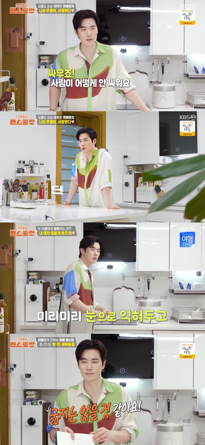 KBS2TV‘신상출시편스토랑’캡처KBS2TV‘신상출시편스토랑’캡처[뉴스엔김명미기자]김강우가부부싸움후두아들앞에서화해를한다고밝혔다.8월22일방송된KBS2TV'신상출시편스토랑'(이하편스토랑)에서는순정셰프김강우의사랑넘치는하루가공개됐다.김강우는지난2010년한혜진언니한무영씨와결혼,슬하에두아들을두고있다.이날김강우는"부부싸움을하기도하냐"는물음에"싸운다.단,그날싸우면그날안에푼다"고밝혔다.이어"아이들이있으니까보는앞에서화해하는모습을보여준다.안거나뽀뽀를하거나악수를하거나장난을친다"며"집안분위기는엄마아빠가좌우하고,애들이불안해하니까"라고설명했다.또김강우는"두아들에게그런이야기는한다.'너무까탈스럽게굴지마라'라고"라며"엄마한테'이것해달라''저것해달라'그러면굉장히혼낸다.'나중에어떤여자가너랑살겠니?엄마니까해주지'라고한다.엄마한테도해주지말라고한다"고덧붙였다.뉴스엔김명미mms2@기사제보및보도자료[email protected]ⓒ뉴스엔.무단전재&재배포금지Copyright©뉴스엔.무단전재및재배포금지.