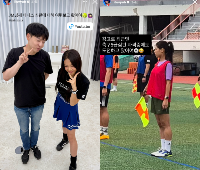 '골때리는그녀들'출연中rrr엔터테인먼트설립해CEOJM과유빈./유빈인스타그램[마이데일리=신예지기자]그룹원더걸스출신유빈이연예계활동을넘어새로운도전에나섰다.유빈은20일자신의인스타그램스토리에"JM님께테니스심판에대해여쭤보고왔어요"라는글과함께국제테니스심판유튜버JM과찍은사진을공개했다.사진속두사람은다정하게브이포즈를취하며미소를지었다.이어유빈은"참고로최근엔축구5급심판자격증에도도전하고왔어요"라며도전소식을알렸다.함께올린사진에서는축구장에서심판깃발을들고꼿꼿하게서있는모습이담겨눈길을끌었다.FC탑걸유빈./유빈소셜미디어유빈은평소축구에대한남다른애정을드러내왔다.SBS예능'골때리는그녀들'(골때녀)에고정출연하며활약중인그는자신의유튜브를통해"골때녀하면서사회성이많이길러졌다.축구를하면서성격도적극적으로변했고,좋은사람들을만나긍정적인영향을많이받았다"라고밝히기도했다.한편유빈은그룹2007년그룹원더걸스로데뷔했다.원더걸스는'TellMe','WhySoLonely','SoHot','Nobody'등수많은히트곡을남겼다.유빈은2020년연예기획사rrr엔터테인먼트설립소식을알리며CEO로도활약중이다.Copyright©마이데일리.무단전재및재배포금지.