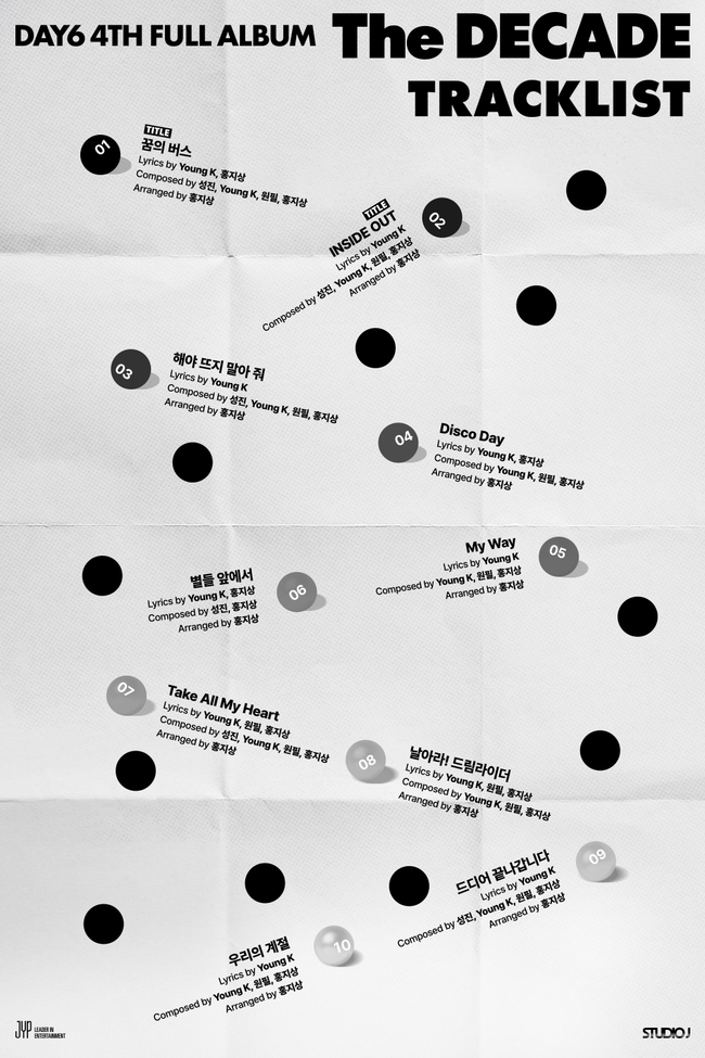 사진=JYP엔터테인먼트[뉴스엔황혜진기자]밴드DAY6(데이식스)가9월5일데뷔첫더블타이틀곡을발표한다.JYP엔터테인먼트는8월18일오후그룹공식SNS채널에DAY6네번째정규앨범'TheDECADE'(더데케이드)의트랙리스트를공개했다.이에따르면DAY6는데뷔이래처음으로더블타이틀곡'꿈의버스'와'INSIDEOUT'(인사이드아웃)을선보인다.신보'TheDECADE'는타이틀곡'꿈의버스'와'INSIDEOUT'을포함해'해야뜨지말아줘','DiscoDay'(디스코데이),'MyWay'(마이웨이),'별들앞에서','TakeAllMyHeart'(테이크올마이하트),'날아라!드림라이더','드디어끝나갑니다','우리의계절'까지총10트랙이수록된다.멤버들이전곡작업에참여했고DAY6와명곡을함께탄생시킨작곡가홍지상이크레디트에이름을올렸다.2019년10월정규3집'TheBookofUs:Entropy'(더북오브어스:엔트로피)이후약5년11개월만에발표하는새정규음반은10년을의미하는영단어를차용해앨범명을지었다.세상의다양한이야기를비롯해사랑에대해노래하며필모그래피를엮어온DAY6가진심을모아완성한새앨범'TheDECADE'로다시한번팬들과대중의마음을사로잡을것으로기대를모은다.새앨범발매에앞서8월30일~31일양일간경기고양시고양종합운동장에서데뷔10주년기념투어'DAY610thAnniversaryTour<TheDECADE>'의포문을연다.국내밴드사상첫단독입성을기록하는이번고양종합운동장공연은전회차전석매진을기록하며압도적티켓파워를입증했다.한편DAY6의정규4집'TheDECADE'는9월5일오후6시정식발매한다.뉴스엔황혜진blossom@기사제보및보도자료[email protected]ⓒ뉴스엔.무단전재&재배포금지Copyright©뉴스엔.무단전재및재배포금지.