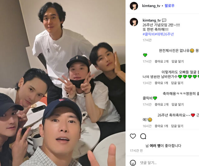네티즌"세월이야속해"밴드→댄스그룹으로!클릭비가데뷔26주년을맞아멤버들이모였다./김태형소셜미디어[마이데일리=문지현기자]그룹'클릭비'가데뷔26주년을맞아모임을진행했다.13일김태형은"기념일은지났지만그래도우리끼리찰칵!26주년축하해"라는글과함께사진을올렸다.이날김태형을비롯해오종혁,김상혁,우연석,유호석,하현곤,노민혁까지카페에둘러앉아근황을공개했다.노민혁은"08,07을기념하며.시간약속을소중히하자"라고자신의소셜미디어에늦게도착한오종혁을겨냥해글을적었다.우연석은"시간차만남.26주년도늦었지만축하하고사랑해"라고글을남겨멤버들에대한애정을드러냈다.사진을본네티즌들은"다시돌아오나?","추억소환이다","여전하네","아저씨들모임","세월이야속해","벌써26년이흐르다니","멋지다","다시컴백해주세요","앨범내주세요"등의반응을보였다.클락비의사진을본팬들은컴백을간절히원했다./김태형소셜미디어클릭비는1999년데뷔했으며5집이후밴드에서댄스그룹으로활동방식을바꿔많은팬들의사랑을받았다.대표곡으로'잊혀진사랑','백전무패','보랏빛향기'등이있으며2015년완전체로재결합하기도했다.Copyright©마이데일리.무단전재및재배포금지.