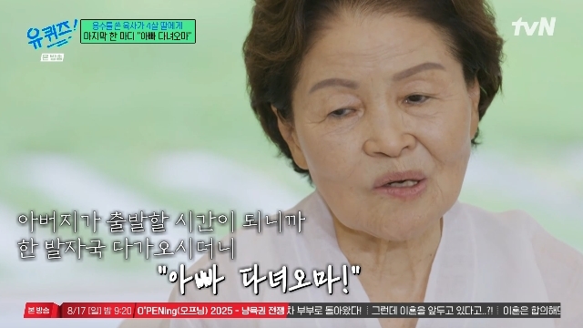 tvN‘유퀴즈온더블럭’캡처tvN‘유퀴즈온더블럭’캡처tvN‘유퀴즈온더블럭’캡처[뉴스엔서유나기자]시인이자독립투사이육사의딸이옥비여사가아버지의마지막말과본인에게남긴선물을공개했다.8월13일방송된tvN예능'유퀴즈온더블럭'(이하'유퀴즈')306회에는17번의옥고를치른저항시인이자독립투사이육사의딸이옥비여사가게스트로출연했다.이육사는1944년광복을보지못하고베이징주재일본총영사관교도소에서순국했다.이날이옥비여사는"제가우리나라나이로4살,만3살일때큰아버지돌아가셔서만주에서돌아오셨다.제사마치고서울로올라가시는중에체포가되신거다.북경으로압송됐다.아버지가가기전에저를데리고청량리역에서기다렸다.아버지가오셔는데굉장히충격이었다.용수를쓰고계셨고실밥이듬성듬성했던게지금도기억난다.눈있는데구멍이2개있고입있는데구멍이3개였다.손은포승줄에감겨있고발엔쇠고랑을차고계셨다.제가너무놀라서몸이덜덜떨렸다"고회상했다.이어"아버지가출발할시간이되니까한발자국다가오시더니'아빠다녀오마'라고얘기하셨단다.전기억이안난다.아버지모습이너무두렵고떨려서.어머니가늘너희아버지가마지막으로남긴말씀이그말이라고해주셨다"고밝혔다.이옥비여사는당시아버지가돌아가실줄아셨던것같다며"저희집이사실부자가아니다.가난한데화신백화점이아무나가는데가아니잖나.화신백화점에가서자주색벨벳으로된투피스와핑크색모자,검은색가죽구두를사오셨다.자기딸사이즈를정확히몰라서굉장히큰걸사오셔서제가6살때까지입었다.독사진을찍으셔서집집에하나씩주면서'삼촌보고싶으면이사진보라'고주셨는데그사진이영정사진이됐다"고말했다.돌아가신날은기억나냐는질문에이옥비여사는"어머니가전보가왔나그랬다.어머니가보더니방을하나비우라하시고비녀를뽑으시더라.머리를풀고서럽고크게곡을하셨다.전영문도모르고어머니가너무슬프게울어서같이운기억이있다"고말했다.이옥비여사는제작진측이선물한AI가족사진에애틋한미소를보였다.또아버지의유해는독립운동가이병희선생이수습해줬다며"간수장이와서새벽에돌아가셨다고했다더라.관뚜껑을여니까저희아버지가온몸이피투성이인채눈을감지못했다더라.'조국은우리에게맡기고가시라'고눈을쓸어주시니그제야눈을감으셨다더라"고전해먹먹함을자아냈다.뉴스엔서유나stranger77@기사제보및보도자료[email protected]ⓒ뉴스엔.무단전재&재배포금지Copyright©뉴스엔.무단전재및재배포금지.