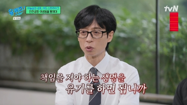 tvN‘유퀴즈온더블럭’캡처tvN‘유퀴즈온더블럭’캡처[뉴스엔서유나기자]방송인유재석이공항근처에반려동물을유기하고가는사람들에게일침했다.8월13일방송된tvN예능'유퀴즈온더블럭'(이하'유퀴즈')306회에는인천공항야생동물통제대남학수,남중수대원이게스트로출연했다.남학수,남중수대원의주요업무는버드스트라이크사고예방이었다.시속960㎞의항공기에1.8㎏의새한마리만부딪혀도64톤의충격이온다고.이들은이를막기위해부지만1700만평인인천공항을한조에12명씩2교대로24시간근무하며통제업무중이었다.이들은조류뿐아니라고라니,유기견,유기묘도공항에서발견된다고밝혔다."공항근처에휴양지가있으니까공항근처에버리고가신다.공항이24시간운영되니까공항으로많이유입되고있다"는것.두대원은"낮에는보는눈이많으니까야간에많이유기를하시는듯하다"며"저희가교대근무를하다보니야간근무를서면유기견,유기묘접수를받는다"고말했다.유재석은"책임을져야하는생명을이렇게그냥유기를하면되냐"고쓴소리했다.이어유기된동물은어떻게되는지궁금해했고두대원은"일단유기묘,유기견의경우엔연결된동물병원으로인계해중성화수술을하고입양이나자연방사를하고있다.조류는포획해서다쳤으면야생동물협회에인계후치료하고방사한다"고말했다.남중수대원은"반려다람쥐를해외여행에데려가려다가검역통과가안되니까,비행기시간이다되니공항터미널화단에버리고가시더라.포획해왔는데동물병원에서도안된다고해서어떻게안돼서제가다입양해왔다"며본인의경우유기묘까지구조해입양한사실을드러냈다.뉴스엔서유나stranger77@기사제보및보도자료[email protected]ⓒ뉴스엔.무단전재&재배포금지Copyright©뉴스엔.무단전재및재배포금지.