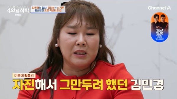 채널A‘절친토큐멘터리4인용식탁’캡처채널A‘절친토큐멘터리4인용식탁’캡처[뉴스엔유경상기자]김민경이댓글의견에따라방송하차를결심한적이있다고말했다.8월11일방송된채널A‘절친토큐멘터리4인용식탁’에서는개그맨김민경이유민상,신기루를초대했다.박경림이“먹는방송찍기전에준비를하냐”고묻자김민경은“따로하는건없다.전날굶지않으려고한다.굶고가서‘한입만’못먹으면서글프고.배고픔이있으면막먹어서조금만먹어도배가찬다.길게못먹는다.페이스조절을조금씩하고가서먹는다”고말했다.유민상은“그냥쭉먹네.오히려제가준비하는편이다.새벽에먹고싶어도안먹는다”고말했고김민경도“나도새벽에는안먹는다”고했다.유민상은“배고프고빈속인게보는사람들이볼때먹고싶은장면을만들기위해서”라고이유를댔다.박경림이“처음에‘맛있는녀석들’섭외가들어왔을때무조건좋았냐”고묻자김민경은“‘개콘’밖에스케줄이없었다.하고싶긴한데유민상,김준현,문세윤사이에서할수있을까?어떻게하지?편하고좋은사람들이니까해보자.이생각으로처음에시작했다”고답했다.유민상은“저는초반일화가유명하다.돈준다니까프로그램섭외니까하자.이거얼마나하겠냐.뚱보넷이모여서밥먹는것비호감이라시청자들이안본다,4주본다.그러고8년을했다.유민상이망한다고하면대박난다는말이있다”며김대희의‘꼰대희’도잘안될거라고했다고밝혔다.김민경은“‘맛있는녀석들’전까지는좋아하는걸많이먹었지이것저것잘먹는스타일이아니었다.내가못먹는것도방송이니먹어야한다.곱창,닭발,선지,내장탕을아예안먹었다.엄마가배신감을느꼈다.내가그렇게끓여줘도안먹더니.집에만가면미꾸라지삶는냄새가나서맡기싫었다.질려서추어탕이싫었다”며추어탕집을운영하는모친의서운함도전했다.김민경은“‘맛있는녀석들’에서먹는데표정이.거짓말을못한다.시청자가음식프로그램을저렇게먹으면자격이있나?하차를원하는댓글이많았다.내가잘못한건맞는데괜히피해를주는것같아서피디,작가를만나하차하겠다고했다.인기가올라가는데저때문에피해주는건싫다.그만하겠다고”라며하차를결심한적도있다고했다.하지만김준현이“널싫어하는사람도있지만좋아하는사람도있는데왜널미워하는사람들만보고그사람들말만듣니?”라고말해마음을고쳐먹었다고.김민경은“맞아.그럼날응원하고좋아한사람들은뭐가되지?더열심히했다.어떻게해야더맛있게깔끔하게먹지?했더니장군이되어가더라.여자인날못놓은것같다.수줍고부끄러워서.나를내려놓고방송을하는계기가됐다.어머니추어탕도지금은먹는다.어머니가너무좋아하신다”고말했다.(사진=채널A‘절친토큐멘터리4인용식탁’캡처)뉴스엔유경상yooks@기사제보및보도자료[email protected]ⓒ뉴스엔.무단전재&재배포금지Copyright©뉴스엔.무단전재및재배포금지.