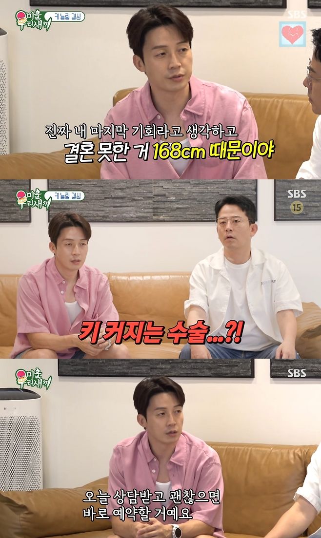 허경환·김준호[서울=뉴시스]최지윤기자=개그맨허경환이키커지는수술을고민했다.10일방송한SBSTV'미운우리새끼'에선허경환이사지연상술상담을받는모습이그려졌다."내인생에마지막으로한번클생각으로왔다.상담받고괜찮으면바로키커지는수술을예약할것"이라며"어차피키작은걸로해먹을만큼해먹었다.마지막기회"라고밝혔다."결혼못한건키168㎝탓일수있다.마지막스퍼트를해야한다"며"키때문에망설이는여자들이몇명있었다.최근소개팅에서도키때문에힘들었다.그친구들이큰것도있지만,내가작은이유도있다.위축됐다"고토로했다."남들은늦었다고하는데지들이뭘알아?작아봤어?"라고해웃음을줬다.개그맨김준호는"그래도얼굴이배우상이고,돈도벌었지,개그도어느정도하지.넌키만크면된다.다가졌는데키만없다"며"네가수술해서멀쩡하면고민해봐야겠다.나도50세까지는169㎝로살았지만,175㎝로살아보고싶다"고바랐다.허경환은"180㎝는원하지도않는다.177~180㎝가되면몸이받쳐줄까싶다"며고민했다.의사는"키는177㎝이지만겉으로볼때180㎝이상으로보일것"이라며"키에비해팔길이가괜찮아810㎝늘리는게가능하다.보수적으로5㎝,평균6~7㎝,많이크는분은13.5㎝까지커질수있다"고설명했다.사지연장술비용은최소4000만원이다.수술보다연장과정에서오는고통이심하다고하자,허경환과김준호는겁에질린듯한표정을지었다.☞공감언론뉴시스[email protected]©뉴시스.무단전재및재배포금지.