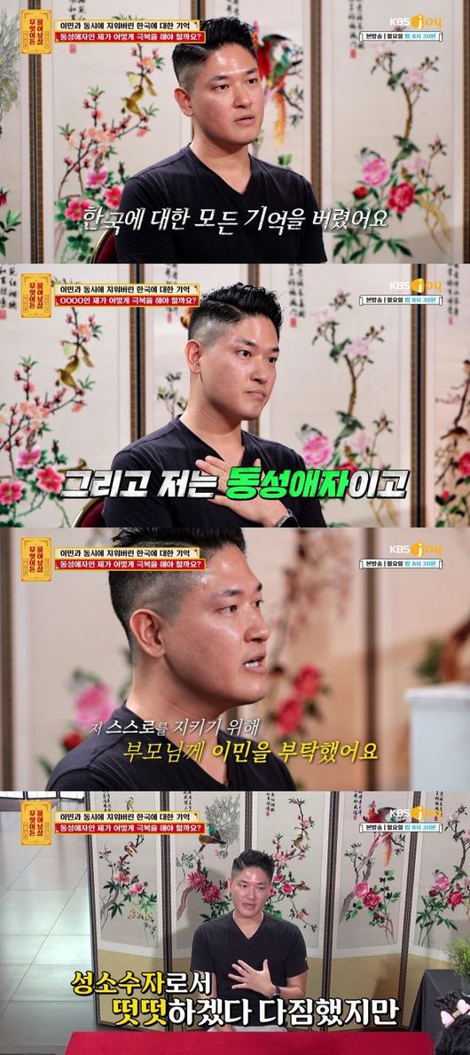 [OSEN=선미경기자]'무엇이든물어보살'40대동성애자사연자가한국에서겪었던아픔에대해고백했다.지난4일오후에방송된케이블채널KBSJoy‘무엇이든물어보살’327회에는미국에서항공조종사로일하고있는사연자가출연했다.사연자는고등학교시절한국을떠나캐나다로이민을갔으며,현재는미국에서거주중인이중국적자라고밝혔다.이어“내가한국에있었을때마음아픈일이있어서한국을떠났는데,지금미국에서편하게잘살고있는데도한국에서있었던슬픔,증오극복이안된다.잘못살아온것같아서어떻게해야할지물어보러왔다”라며사연을설명했다.이수근이고등학교시절한국에서힘들었던일이이민결정에영향을준것이냐고묻자,사연자는그렇다면서,“어렸을때부터여성스럽다고아이들한테많이놀림당하고,왕따당하고,맞기도하고,친구없이그렇게살았다”라고소개했다.그는본인이동성애자임을고백하며,고2때처음사귄친구가자신과어울리자다른아이들로부터사연자의애인이냐며놀림당하는상황을마주한후‘한국에서는잘못살것같다.외국에보내달라’고해서한국을떠났다고밝혔다.사연자는“처음에캐나다가서‘한국’자체가싫어서옛날기억을다버렸다.졸업앨범,노래테이프,CD.한국사람절대안만났다”라고말했다.이에서장훈은“한국에있었을때괴로웠기때문에,한국에대한기억이나모든걸지워버리기위해서한국어도안쓰고한국사람도안만나고이러다보니까말이이렇게됐을수도있겠다고이해가된다”라며한국말이서툰사연자를이해하는모습을보였다.캐나다생활이어땠냐고묻는이수근에게,사연자는“쉽지않았다.교회에서커밍아웃하고쫓겨났다”고답했고,“나자신이살고싶은대로살수있고,맞는것도없다”라고덧붙였다.“부모에게도밝혔냐”라는서장훈의질문에,사연자는“얼마안됐다.떳떳하게나자신위해서살겠다했는데도가족들한테도말을못하겠더라”라면서,“동생한테먼저말했다”라고말했다.이어“미국에서결혼해서남편과10년동안있었다가2년전에이혼했다”라고밝혔다.사연자는30대후반부터인생에대한깊은이야기를부모와나누지못것에관해여러생각이들었다고설명했다.그는부모님을잃더라도커밍아웃해야겠다고마음먹었다면서,“말했는데난리가났다.소리지르고,울고”라며,“작년에둘이서울퀴어퍼레이드가서다른게이부모들을만나고나한테한말이‘네가게이로서이세상을이렇게힘들게살아온걸몰랐다’”라고했고,“그때부터엄마,아빠하고더말하게됐다”라면서,“마음이많이풀어졌다”라고이야기했다.이에서장훈은“부모가가장넘기힘든벽이다”라면서“가장큰벽을넘었네”라고위로를전했다.한편,사연자는그동안한국을잊고살았으나,다시한국을떠올리게한경험을밝혔다.그는유튜브에서머리카락염색방법을찾던중우연히K-POP영상을보게됐다고한다.처음엔거부감이들어안봤지만,어릴때듣던한국노래가나오자저도모르게듣게됐고,눈물이났다고소개하며,이때를기점으로한국이계속생각났다고말했다.사연을들은서장훈은“여러가지로가슴이아프다”,“어릴때부터얼마나고생했냐.이게본인이내맘대로바꾸고어쩌고할수있는문제도아닌데”라며“마음을더편안하게가지면한국을대하기가편해지지않을까”라고조언했다.이수근은“네가행복해야부모도행복한것”이라고덧붙였다.마지막으로,사연자는“내사진이로맨스스캠에지금사용되고있다”라면서로맨스스캠의당사자가본인이아님을해명하고싶다고부탁했고,서장훈은시청자들에게“속지말라”라고메시지를전하며그의부탁에응했다./[email protected][사진]KBSJOY방송화면캡처.Copyright©OSEN.무단전재및재배포금지.