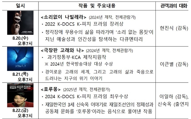 K-DOCS다큐상영회상영작.과기정통부제공과학기술정보통신부는한국방송통신진흥원(KCA),한국교육방송공사(EBS),현대홈쇼핑과함께‘2025K-닥스(K-DOCS)페스티벌’을오는20~22일에개최한다고4일밝혔다.행사의프로그램으로‘다큐상영회’도올해처음선보인다.K-닥스는과기정통부가국내다큐멘터리활성화를위해민·관합동으로2022년부터추진해온다큐멘터리전주기제작지원사업이다.우수다큐멘터리발굴및제작지원,제작자역량강화,투자연계,해외진출등을지원한다.올해부터는행사명을‘K-닥스페스티벌’로전환하고,그간K-닥스등에서발굴·지원한우수다큐멘터리를국민들과즐길수있도록‘다큐상영회’를신설했다.다큐상영회는20일부터22일까지3일간서울CGV명동역씨네라이브러리ART1관에서매일오후7시에열린다.상영이후에는각작품의감독과주요출연진이참여하는‘관객과의대화’자리도마련된다.오는20일다큐상영회1일차에는2022년K-닥스프라임장려상수상작으로,청각장애무용수가만드는자기만의음악과예술세계를이야기하는‘소리없이나빌레라’를선보인다.21일상영작은과기정통부와KCA의제작지원작이자지난해한국방송대상대상을수상한SBS의‘고래와나(극장판)’이다.3일차인22일에는지난해K-닥스프라임최우수상수상작으로,재일한국인3세인권운동가이자여성사업가인신숙옥의삶을담은‘호루몽’이상영된다.다큐상영회는전회차무료로진행된다.상영회티켓신청은누구나가능하다.이날오후2시부터K-닥스공식홈페이지에서선착순으로접수한다.강도성과기정통부방송진흥정책관은“앞으로도다큐멘터리제작·유통활성화와함께사회적가치확산및저변확대에도적극적으로뒷받침하겠다”고말했다.김나인기자[email protected]©디지털타임스.무단전재및재배포금지.