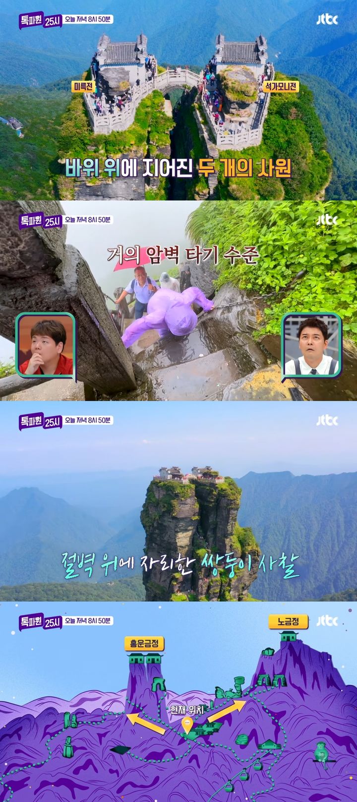[서울=뉴시스]ㅇ(사진=유튜브'JTBCEntertainment'캡처)[email protected]*재판매및DB금지[서울=뉴시스]전수민인턴기자=중국톡파원이궂은날씨와험난한길을뚫고홍운금정의실물을보러등반에나선다.4일방송하는JTBC예능프로그램'톡파원25시'에는홍운금정을보러출발하는중국톡파원이야기가담긴다.홍운금정은중국구이저우성판징산에있는봉우리다.톡파원은비가오는날맨몸으로등산을시작한다.톡파원은웃으며계단을올라간다.스튜디오에있던방송인줄리안은톡파원을보며"아직웃고계시네요"라고말한다.궂은날씨에도정상에는많은사람이북적인다.안개속에서판징산의꼭대기가보인다.절벽위에쌍둥이사찰두개가자리잡고있다.사원두개는석가모니전과미륵전이다.톡파원은날씨운이따라줘야감상할수있는곳으로이곳은쉽게볼수없는곳이라고언급한다.또톡파원은등산로가좁아하루등반객수가8000명으로한정됐다고한다.톡파원은사찰에도착하기위해120m를추가로등반한다.매우가파른암벽등반수준의경사를보고스튜디오패널들은경악한다.이날방송은'가장위대한현대건축물'이라는주제를다룬다.게스트로는유튜브곽튜브가함께한다.☞공감언론뉴시스[email protected]©뉴시스.무단전재및재배포금지.