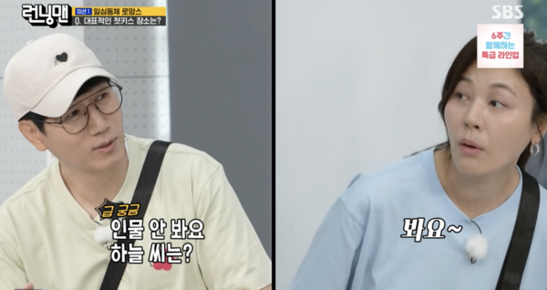 [스타뉴스|김정주기자]/사진=SBS예능프로그램'런닝맨'방송화면배우김하늘이보수적인연애관을드러냈다.3일방송된SBS예능프로그램'런닝맨'에서는소속사식구인김하늘,남우현,이준영이출격해삼남매케미를선보였다.이날멤버들은첫번째미션으로만장일치퀴즈에도전하는'일심동체로망스'를진행했다.유재석은'내애인과이성친구의만남가능장소'를묻는질문에'사람의왕래가굉장히많은대로변에서잠깐'이라는구체적인답변을내놔웃음을자아냈다.이에지석진은"은근히질투가많다"고야유를보냈고,김종국은"한복을입고다녀라"라고지적해모두를폭소케했다.같은팀인김하늘과양세찬은카페를적어점수를획득했다.김하늘은"카페에나란히앉아있는것은어떻냐"는질문에"옆에는안된다.맞은편에앉아야한다"고선을그었다.지예은역시"그건헤어지자는거다"라고강경한입장을보였다./사진=SBS예능프로그램'런닝맨'방송화면이에김종국은"자리가일자로된데밖에없다"고상황을설정하자김하늘은"다른카페가야한다.옆에앉는건말이안된다"라고보수적인입장을고수했다.김하늘은또"1시에낮술은되느냐"는하하의질문에"절대안된다.술은안된다"라고차단했다.유재석이"왜안되느냐"고이유를묻자김하늘은우아한목소리로"술은안되죠"라고받아쳐웃음을자아냈다.김종국은"와인정도는괜찮다.밥먹으면서한잔까지는허용된다"고말했지만,김하늘은"그래도와인은안돼"라고반대의견을내놨다.김정주기자[email protected]©스타뉴스&starnewskorea.com,무단전재및재배포금지