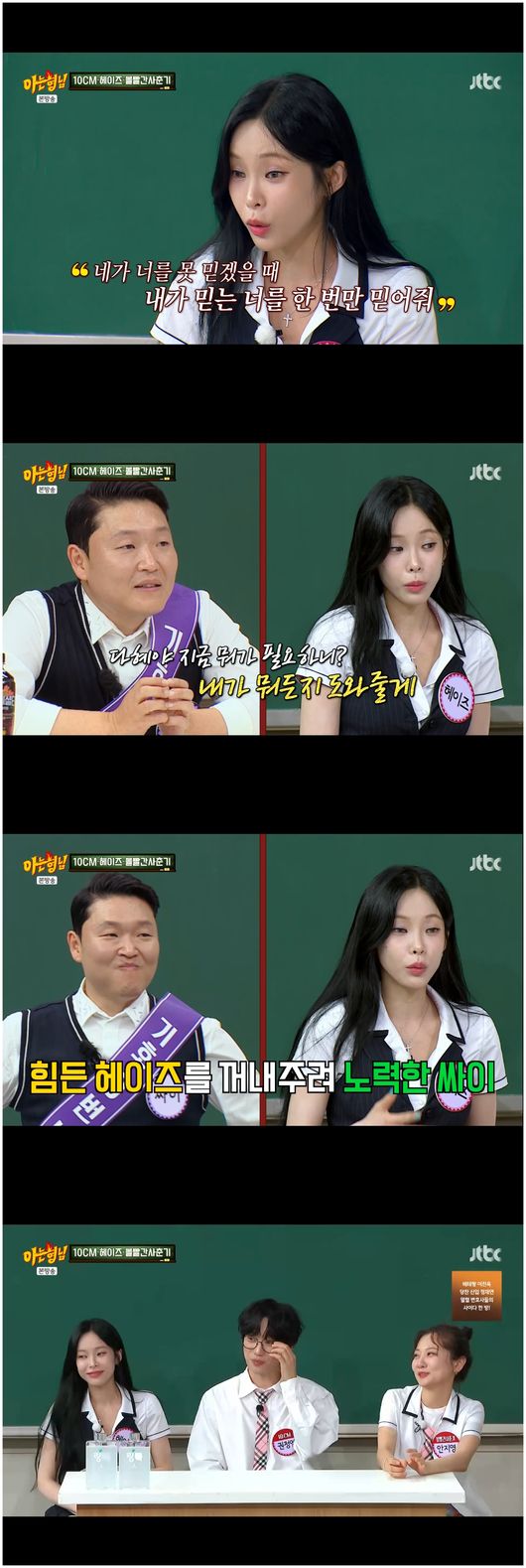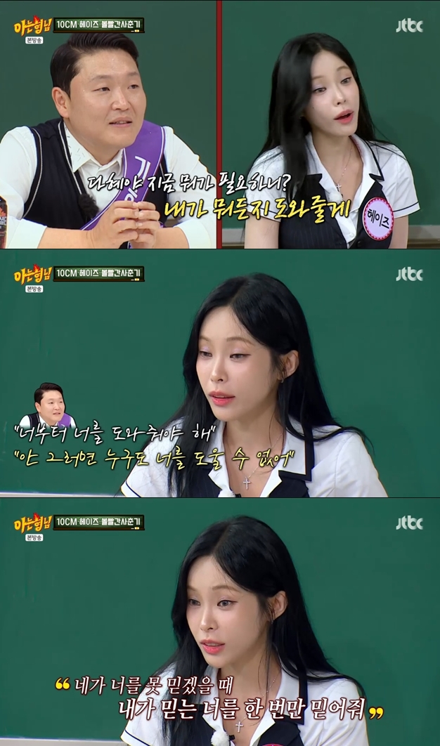 ▲출처|JTBC'아는형님'캡처[스포티비뉴스최신애기자]헤이즈가싸이덕에슬럼프를극복했다고밝혔다.2일방송된JTBC'아는형님'에는10CM,헤이즈,볼빨간사춘기가출연했다.이날헤이즈는'슬럼프'에대해"좀심각했다.그런데그때되게감사한사람이싸이오빠였다.오빠가나를꺼내주려고많이노력했다"고고백했다.이어헤이즈는"싸이오빠가나한테전화를해서'내가너를도와주겠다.그런데너부터너를도와야해.그럼그때부터세상이널도울거야.혹시네가너를못믿겠을때내가믿는너를한번만믿어줘'라고하더라"며울컥했던당시를밝혔다.그러면서헤이즈는"그때밖에나와서해도보고했다.그러면서나아져갔다"며슬럼프를싸이덕에이겼다고전했다.그러자서장훈은"아직완전히낫진않지?그때'물어보살'을찾아와라.그런것을아주탈출할수있도록,머릿속을시원하게만들어주겠다"고해웃음을안겼다.<저작권자ⓒSPOTVNEWS.무단전재및재배포금지>Copyright©스포티비뉴스.무단전재및재배포금지.