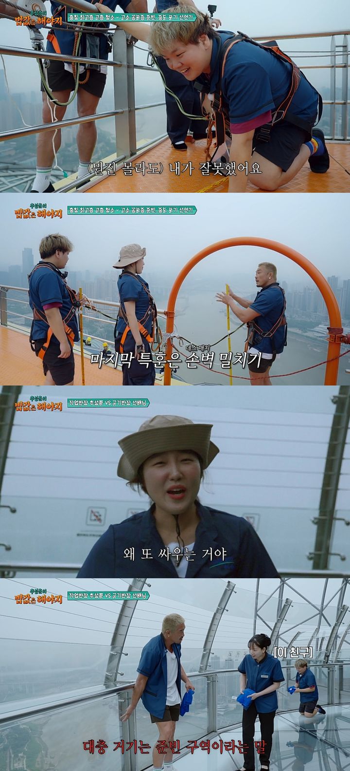 [서울=뉴시스]오는2일방송하는EBS·ENA예능프로그램'추성훈의밥값은해야지'에서는출연진추성훈·곽튜브·이은지가충국충칭에서250m높이의스카이브리지청소에도전한다.(사진=EBS·ENA'추성훈의밥값은해야지'제공)[email protected]*재판매및DB금지[서울=뉴시스]신지아인턴기자=여행유튜버'곽튜브'(곽준빈)을위한이종격투기선수겸방송인추성훈의첫번째레슨이시작된다.2일오후7시50분방송하는EBS·ENA예능프로그램'추성훈의밥값은해야지'에서는출연진추성훈·곽튜브·이은지가중국충칭에서250m높이의스카이브리지청소에도전한다.곽준빈은고소공포증이있어아찔한풍경이내려다보이는스카이브리지청소에적응하지못해추성훈의도움을받는다.이은지는"이렇게목숨을걸고해본건처음인것같다"고말한다.이에곽준빈도"아르바이트13개경력중정신적으로이제제일힘들다"고털어놓는다.이에추성훈은곽준빈이청소를고소공포증극복기회로삼을수있기를바라며특훈에몰입한다.그런가하면추성훈과현지아르바이트선배의숨막히는대결도성사된다.선배는중국어로코칭하고,추성훈은한국어로작업진행상황을설명하며서로다른언어로대립을이어간다.이은지는"돈벌러와서왜싸우냐"며나무란다.그런가하면이들은힘든노동후꿀맛같은충칭여행도펼친다.☞공감언론뉴시스[email protected]©뉴시스.무단전재및재배포금지.