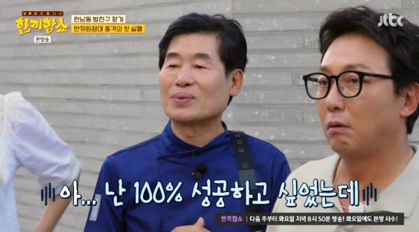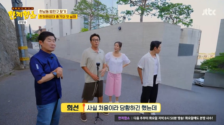 한끼합쇼/사진=JTBC캡처[스포츠투데이정예원기자]'한끼합쇼'가한남동에서처음으로실패의쓴맛을봤다.31일방송된JTBC예능'한끼합쇼'에서는MC탁재훈,김희선이게스트이규형,이연복셰프와함께서울용산구한남동으로한끼원정을떠나는모습이그려졌다.한끼합쇼/사진=JTBC캡처먼저탁재훈,김희선은이규형과함께한남동이곳저곳을구경했다.한남동주민인이규형은"여기가기운이저와잘맞는것같다.금호동에도살았는데4개월만에나왔다.무명연극배우시절에한남동으로독립을했는데,그이후에드라마가연달아잘되며이름을알릴수있었다"고말했다.이어세사람은'중식대가'이연복셰프와함께'밥친구'찾기에나섰다.첫번째도전은이규형이나섰지만,집주인이식사를마쳐실패로끝났다.두번째도전역시집주인의부재로실패하게됐다.세번째도전도"저희는(촬영에)관심이없다"는말을들으며발길을돌려야했다.네사람은계속해서실패의쓴맛을봤다.촬영은괜찮으나집에손님이와있어어렵다는집주인,집에아무것도없어부담스럽다는집주인등저마다의사정이존재했다.한끼합쇼/사진=JTBC캡처결국정해진시간이다다랐고,네사람은'한끼합쇼'역사상첫실패를기록하게됐다.탁재훈은"규형씨의소감을들어봐야할것같다.지금까지한번도실패한분이없었다"고말했다.이에이규형은"이게저때문인가싶다.제가내후년까지삼재다"라며'셀프디스'를해웃음을자아냈다.이셰프는"앞으로섭외할때삼재있는지없는지확인해야하는거아니냐"고거들었다.결국이들은'편의점한끼'를하게됐다.한국소비자원의조사결과에따르면국민1인당편의점에한번방문할때쓰는평균금액은1만710원이었다.네사람은편의점에방문해인당1만710원한도에서음식을구매했다.네사람은각자의레시피대로음식을조리하기위해상품을골랐다.김희선은으깬함박스테이크와양파,치즈를피자위에올려전자레인지에돌렸다.이셰프는자신의주특기인중식에도전,핫바와양파를잘라짜장라면에나눠담았다.한끼원정을위해손수챙겨온중식도를편의점에서사용하는모습이웃음을유발하기도했다.두사람의레시피는성공적이었다.음식을맛본이들은모두감탄사를연발하며맛깔나는'먹방'을선보였다.특히탁재훈은"진짜중식당에서먹는맛이난다"며이셰프의라면을치켜세웠다.끝으로이규형역시바닐라아이스크림에과자를뿌린디저트를선보여탁재훈의칭찬을받았다.[스포츠투데이정예원기자[email protected]]Copyright©스포츠투데이.무단전재및재배포금지.
