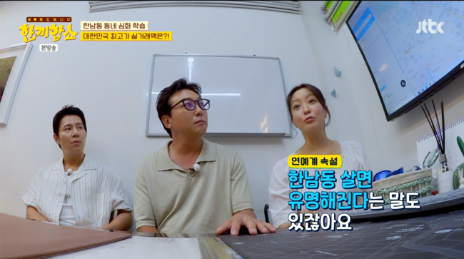 [OSEN=박근희기자]'한끼합쇼’김희선,탁재훈,이규형이실거래가250억원을호가하는한남동을방문했다.31일전파를탄JTBC예능‘한끼합쇼’에는다양한드라마속밀도있는연기로호평받고있는배우이규형이출연했다.오랫동안한남동에거주했다는이규형은잠시금호동으로이사했으나4개월만에다시한남동으로돌아왔다고전했다.그는한남동달동네에살다가드라마'슬기로운감빵생활'과'비밀의숲'에캐스팅되면서대중에게얼굴을알리게되었다며,이모든것이한남동의긍정적인기운덕분이라고설명했다.이후이규형은탁재훈,김희선과함께한남동부동산에들렀다.한남동은최근실거래가가250억을넘는다는이야기에모두놀라는모습을보였다.김희선은"한남동살면유명해진다는말ㄷ있다"며한남동이연예인들에게'핫플레이스'임을간접적으로드러냈다.실제로부동산사장님은한남동에거주하는연예인으로엄정화,지드래곤,태양,소지섭,블랙핑크제니,방탄소년단등을언급해모두를놀라게했다./[email protected][사진]‘한끼합쇼'방송화면캡쳐Copyright©OSEN.무단전재및재배포금지.