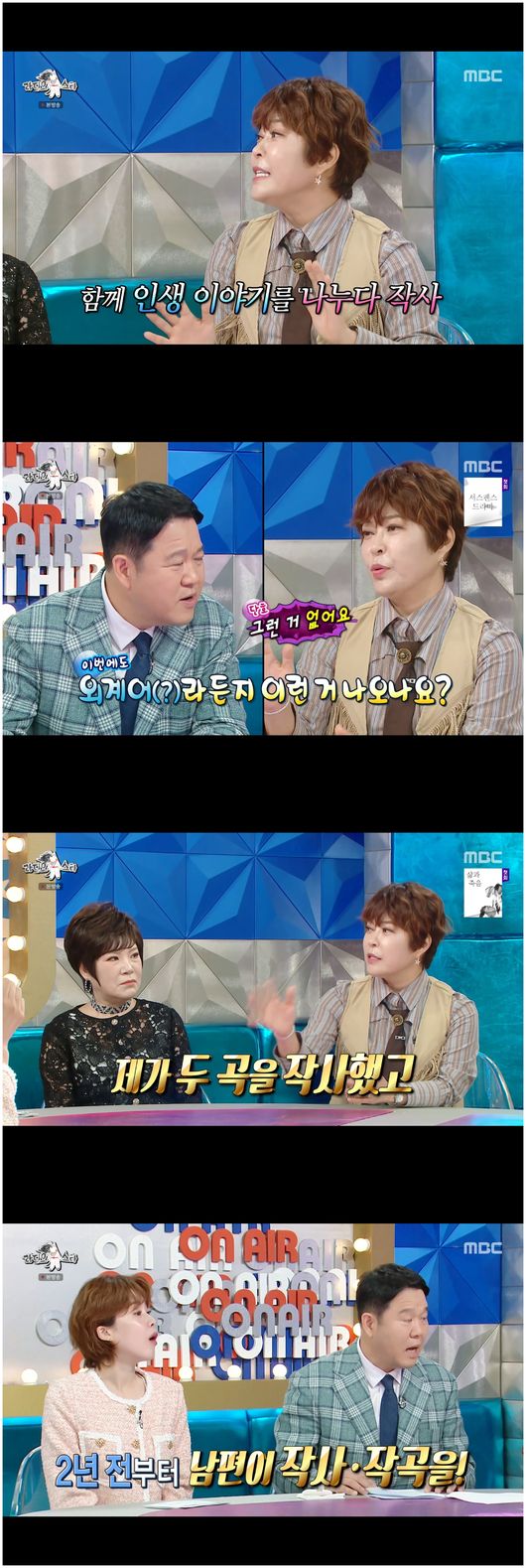 [OSEN=오세진기자]‘라디오스타’개그우먼조혜련이남편에대한애정을흠뻑드러냈다.30일방영된MBC예능‘라디오스타’에서는밴드페퍼톤스와함께'메카니즘'을결성해신곡을낸조혜련이등장했다.조혜련은“제가여러가지새로운걸많이도전하지않냐.이번에밴드를결성했다.페퍼톤즈와함께한다”라면서“제가작사를두곡정도했다.타임머신을타고옛날을생각하는그런노래다”라며노래를설명했다.이노래에는비하인드가있었다.조혜련은“이이야기는남편과인생에대해서이런저런이야기를하다가작사를하게됐다.남편이2년전부터트로트작사나작곡을하는달란트가있던거다”라고말하며남편에대한재능을전해모두를놀라게했다.이어조용조용한페퍼톤스에대한질문에조혜련은“페퍼톤스가카이스트출신인데내향인이다.자기의견을잘못드러내더라.나는의상을반짝이로가고싶었다.브루노마스같은노래의상이좋더라”라면서“처음에아이디어를냈을때그것도좋겠네요,하더니매니저한테연락와서‘반짝이안입겠다’라고하더라”라고말해웃음을안겼다./[email protected][사진]MBC예능‘라디오스타’Copyright©OSEN.무단전재및재배포금지.