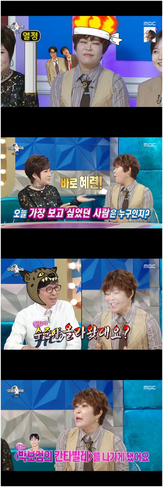 [OSEN=오세진기자]‘라디오스타’개그우먼조혜련이겹경사를전했다.30일방영된MBC예능‘라디오스타’에서는가수김연자,개그우먼조혜련,아나운서김수지,유튜버쯔양이등장했다.‘열정과잉녀’로소개된조혜련은연극연출은물론가수로서도활약중이었다.최근밴드'페퍼톤스'와함께곡을낸조혜련은크게또한번인기를얻었다.조혜련은“‘사랑해엄마’라는연극연출을했다.호주시드니에서공연하고돌아왔다.500석으로4번을했는데전석매진을하고,10월에는LA에서공연을한다”라며최근의쾌거를전했다.이어조혜련은“이번에KBS에서‘아나까나’가심의통과가됐다.세번요청했는데처음에는수준미달로탈락했었다.‘박보검의칸타빌레’에나가게돼서거기PD님이이노래를부르는걸보기위해서통과시켰다”라며기쁜소식을전했고,이에김국진은“이번에는그럼수준이올라가서통과된거냐”라며순수하게질문해웃음을안겼다./[email protected][사진]MBC예능‘라디오스타’Copyright©OSEN.무단전재및재배포금지.