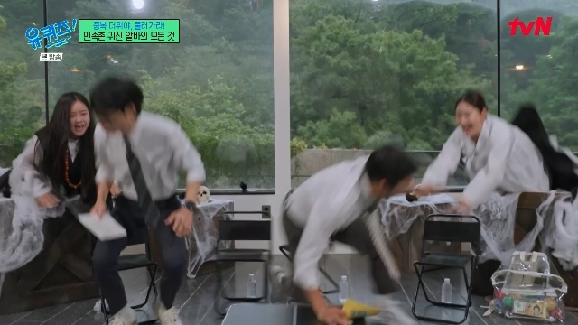tvN‘유퀴즈온더블럭’캡처tvN‘유퀴즈온더블럭’캡처[뉴스엔서유나기자]방송인유재석,조세호가귀신에게습격을당했다.7월30일방송된tvN예능'유퀴즈온더블럭'(이하'유퀴즈')304회에는민속촌귀신알바최정은,노은숙자기님이게스트로출연했다.이날비가추적추적내리는날씨에"비가오니더무섭다","으스스하다"며녹화를준비하던유재석,조세호뒤로숨어있던게스트들이깜짝등장했다.괴성과함께등장한두게스트에유재석,조세호는화들짝놀랐다.바닥에엎어진조세호와유재석사이충돌사고가일어나기까지.조세호는"다박살났네"라며너무놀라엎어지면서마이크를박살낸사실을드러냈다.뉴스엔서유나stranger77@기사제보및보도자료[email protected]ⓒ뉴스엔.무단전재&재배포금지Copyright©뉴스엔.무단전재및재배포금지.