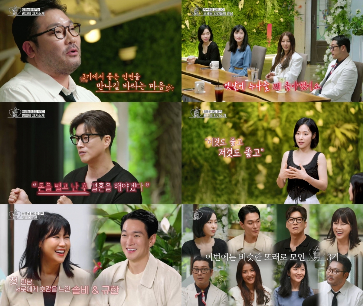 [스타뉴스|김나연기자]사진=KBSJoy오래된만남추구3기'오래된만남추구'가3기출연진들의진솔한자기소개와반전매력으로새로운로맨스의시작을알렸다.28일KBSJoy·KBS2TV·GTV를통해방송한'오래된만남추구'(이하'오만추')에서는송병철,이규한,박광재,이켠,장소연,황보,솔비,홍자등3기출연진8인의첫만남이그려졌다.이들은자기소개를통해오래된인연속호감의불을다시켜보는여정을시작했다.가장이목을집중시켰던건'오만추'2기멤버박광재의재출연이었다.박광재는"아팠다면경험,좋았다면추억인데,2기에서경험을한번했기에이번엔좋은추억을만들고싶다"고3기에다시출연하게된이유를밝혔다.이어그는"드라마나영화에서한번도멜로를한적이없다.여기서못해봤던멜로를찍어보고싶다"는각오도전했다.그가이번3기에서로맨스영화의주인공이될수있을지관심이집중된다.이규한은진정성넘치는자기소개로주목받았다.그는"40대가돼연기인생을되돌아보니아쉬운점이친구가없더라.속마음을털어놓을사람이전혀없었다"며"자격지심이있었다.어느순간동료들이경쟁상대로보였다"고솔직하게고백했다.꾸밈없이자신을드러내는이규한에게솔비는"떨리는목소리가진정성있게다가왔다"며그를향한호감을표현했다.홍자는"운동을안좋아하는데크로스핏,골프,테니스를잘한다"며의외의모습을공개했고,"물을무서워하는데최근에배면허를땄다"는엉뚱한매력을선보였다.솔비는"실패했던대시는없었다.내가마음먹었을때연애에성공했다"며자신감을드러냈고,"내게다가와줬으면하는사람이있다"고호기심을자극했다.송병철은"데이트를어떻게시작할지모르겠더라.다시연애세포를살리고싶었다"고말하며,5년전금연했다는사실을공개했다.또이상형으로술,담배하지않고,말을예쁘게하는사람을이야기해눈길을끌었다."몸과마음이다건강해보인다"며송병철에게호감을드러낸장소연은연변사투리,영어,일본어,중국어,한국어등총5개언어로자신을소개해모두를놀라게했다.황보와이켠의재회는드라마틱했다.두사람은2003년KBS'산장미팅-장미의전쟁'에서처음만났는데,이켠은당시를떠올리며"어릴때누나를꽤좋아했다"고솔직하게고백했다.황보는"이켠이되게수줍음많았던거로기억하는데,날좋아해서그랬던건가?진지하게생각하게되더라"고말해오래된인연의발전가능성을내비쳤다.자기소개가끝나고첫인상투표가진행됐다.이번기수에선마음이통한남녀만1대1심야드라이브데이트를나설수있었는데,이규한과솔비가서로를선택해눈길을끌었다.솔비는"자기소개듣고좀새로운모습이었다.둘이있을때어떤모습일지궁금해졌다"고했고,이규한은"예전부터즐겁게해줬고,함께하면더즐거울것같다"며선택의이유를밝혔다.방송이끝난뒤공개된다음주예고편에서는솔비와이규한의심야드라이브데이트와본격적인인연여행이담겼다.특히인연여행의첫번째데이트는여자출연자들의선택으로결정되는데이트로,3기러브라인의향방을가릴수있을것으로보인다.한편'오래된만남추구'는매주월요일오후9시50분KBSJoy와KBS2,GTV에서동시방송한다.김나연기자[email protected]©스타뉴스&starnewskorea.com,무단전재및재배포금지