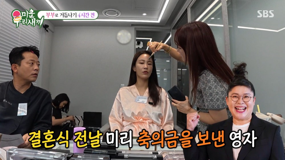 [TV리포트=은주영기자]코미디언이영자가후배김준호와김지민에게통큰축의금을전달했다.지난27일방송된SBS'미운우리새끼'에서는김준호와김지민의결혼식당일모습이그려졌다.결혼식이시작되기전메이크업을받던두사람은하객들의결혼식참석여부에대한이야기를꺼냈다.김준호는"못온다는사람들이속출하고있다"라며걱정했다.김지민은그를거들며"영자선배가어제연락을주셨다.축의금을양쪽에다많이주셨더라"라고말했다.그가"못오셔서축의금미리보내신거죠"라고묻자이영자는"나이미와있다.내식권은두개준비해라"라며농담을건넸다고전했다.실제로이영자는이들의결혼식에참석한것으로드러났다.이영자는개인채널에'화제의결혼식다녀온이영자3도생활브이로그'라는영상을게시했다.그는영상에서결혼식에참석한여러사람들을만나고맛있게식사를즐기는모습을담았다.또"사는동안서로스트레스주지않고넉넉한마음으로살았으면좋겠다"라며결혼축하메시지를보내며훈훈한분위기를연출했다.이날방송에는1200명의하객을동원한두사람의화려한결혼식모습이공개됐다.연예계스타들이총출동한가운데김지민어머니의축사가눈길을끌었다.딸의행복한앞날축하하고아버지에대한그리움을어루만지는어머니의진심에김지민은결국눈물을보였다.앞서결혼식당일선배코미디언김대희가김지민의아버지를대신해그의손을잡고버진로드를행진한것이알려져화제가된바있다.은주영기자[email protected]/사진=SBS'미운우리새끼',채널'이영자TV'Copyright©TV리포트.무단전재및재배포금지