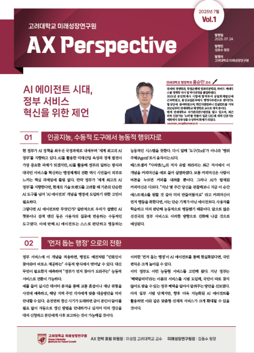 AX퍼스펙티브고려대학교미래성장연구원이운영하는AX전략포럼은인공지능전환(AX)이슈에관한포럼전문가들의분석과대안을담은'AX퍼스펙티브'를정기발간한다고27일밝혔다.AX퍼스펙티브는창간호로'AI에이전트시대,정부서비스혁신을위한제언'을발간했다.창간호는홍순만연세대행정학과교수가집필했다.홍교수는공인회계사출신으로맥킨지앤컴퍼니컨설턴트를거쳐현재연세대국가관리연구원장을맡고있으며,최근바둑인공지능'노바'로세계인공지능대회독창상을수상한AI전문가다.홍교수는정부가'세계최고의AI정부'를실현을위해기존의수동적AI도구를넘어능동적으로판단하고행동하는'AI에이전트(agent)'개념을행정에도입해야한다고제언했다.AI에이전트도입의주요제도적장벽으로△신청주의행정체계의한계△데이터연계와개인정보보호의장벽△공직사회의감사부담과책임문제△경직된예산편성절차등네가지를지적했다.국민이직접신청해야만서비스를받을수있어기존의신청주의행정체계가AI의능동적서비스와상충하고,부처간칸막이행정과개인정보규제로인해데이터통합활용이어려운실정이라고진단했다.또한AI오류발생시책임소재불분명과감사위험에대한부담,AI시스템도입에최소2∼3년이소요되는경직된예산구조등이혁신의걸림돌이되고있다고분석했다.이에대한개선방안으로AI에이전트도입을위한단계적로드맵수립과시범사업을통한제도개선효과검증을제안하며,법령정비,공직문화혁신,예산제도유연화등의병행추진을강조했다.AX전략포럼위원장인이성엽고려대교수는“에이전트AI도입등공공AX는민간AX를리드하는마중물역할을해야하지만,개인정보및국가기밀보호규제,행정처분의경우기속행위에만허용되는한계,공적결정을AI에게맡기는것에대한이념적문제등으로인해여러제약이있는만큼조속히이에대한사회적공론화와합의를진행해야할것”이라고말했다.박지성기자[email protected]©전자신문.무단전재및재배포금지.