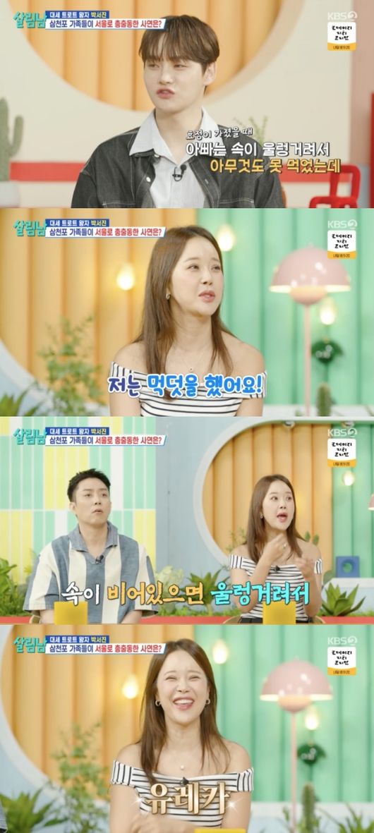 [OSEN=임혜영기자]백지영이‘먹덧’을경험했다고밝혔다.26일방송된KBS2TV예능프로그램'살림하는남자들시즌2'(이하'살림남’)에는박서진이여동생의생일파티를몰래준비하는모습이그려졌다.이날가족들은생일파티를준비하며과거이야기를나누었다.박서진의아버지는“효정이가졌을때입덧을내가했다”라고말했고,박서진은사랑꾼들이입덧을대신한다고말했다.박서진은“아빠는음식냄새만맡아도힘들어했는데,엄마는너무잘먹어서뚱뚱했다더라”라고말했다.이를듣던백지영은“그때부터시작한것같다.나는먹덧을했다.속이비어있으면토가나온다”라며임신중계속음식을먹었다고밝혔다.이에박서진은“아직도안고쳐졌냐”라고물으며먹는것을좋아하는백지영을은연중에공격해웃음을자아냈다./[email protected][사진]KBS2TV예능프로그램'살림하는남자들시즌2'Copyright©OSEN.무단전재및재배포금지.