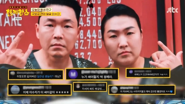 코미디언이수지가가수싸이와닮은꼴이라는사실을인정했다./사진=JTBC예능'한끼합쇼'코미디언이수지가가수싸이와닮은꼴이라는사실을인정했다.24일방송된JTBC예능'한끼합쇼'에는이수지가게스트로출연해김희선,탁재훈과이야기를나눴다.방송에서김희선은최근싸이콘서트'흠뻑쇼'에서이수지가닮은꼴로등장한오프닝영상을언급했다.이수지는"촬영하고잘나왔나모니터를보지않냐"며"제가자꾸싸이형님을보고있더라"고말해웃음을자아냈다.그는"나도헷갈려"라고토로하기도했다.한편이수지는최근'싸이흠뻑쇼SUMMERSWAG2025(썸머스웨그2025)'의오프닝영상에싸이분장을하고등장해완벽한싱크로율의비주얼과퍼포먼스를뽐냈다.도플갱어급닮은꼴인두사람은'러브버그듀오'라는별명을얻으며화제가됐다.박다영기자[email protected]©머니투데이&mt.co.kr.무단전재및재배포,AI학습이용금지.