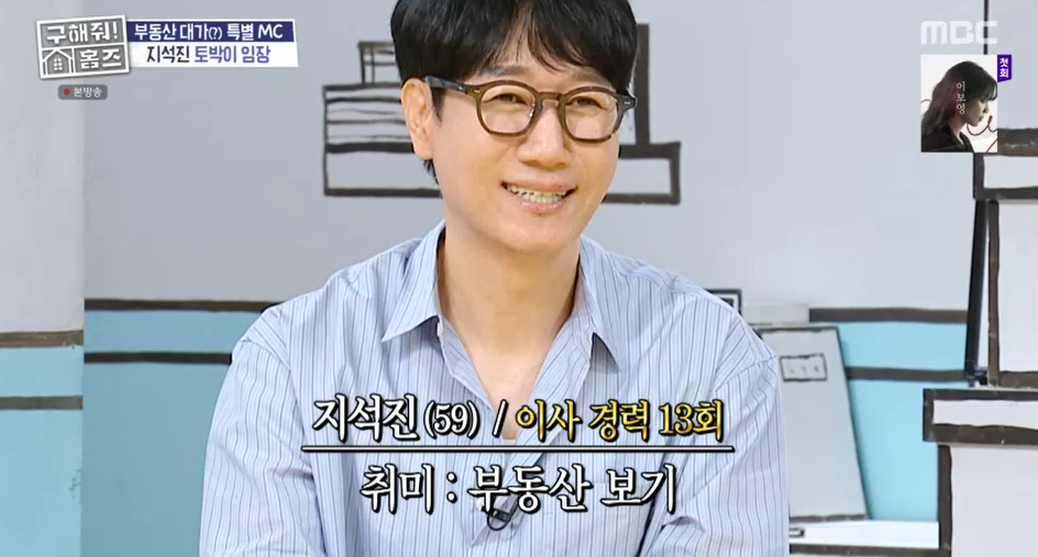 (엑스포츠뉴스우선미기자)지석진이강북구수유동으로토박이임장을떠난다.24일방송된MBC'구해줘!홈즈'(이하'홈즈')에서는수유동에서자란방송인지석진이절친김수용과양세찬을데리고지역임장을떠났다.이날지석진은해외를간박나래를대신해등장했다.지석진은결혼후이사경력만13회이며,취미가집에가서2시간3시간씩부동산보는것이라고밝혔다.지석진은"하루일과가일끝나면집에가서샤워하고로드뷰를통해서보는거다.그냥재밌어서본다.시세가얼마인가"라고전했다.양세찬은지석진이터를굉장히잘본다고들었가며"홈즈의터는어떠냐"라고물었다.지석진은"임장다녀왔지않았냐.기가막힌다"라며'구해줘!홈즈'의터에관해이야기했다.지석진은"잘되는이유가있다.제작진하고인사하는모습을보니까사이가좋더라.근데그런생각이들더라.한프로그램에꼭형제가둘다있어야하나.수용이가그냥온게아니다"라며양세찬과양세형의자리를노리고온것이라고밝혀웃음을자아냈다.사진=MBC방송화면우선미기자[email protected]©엑스포츠뉴스.무단전재및재배포금지.