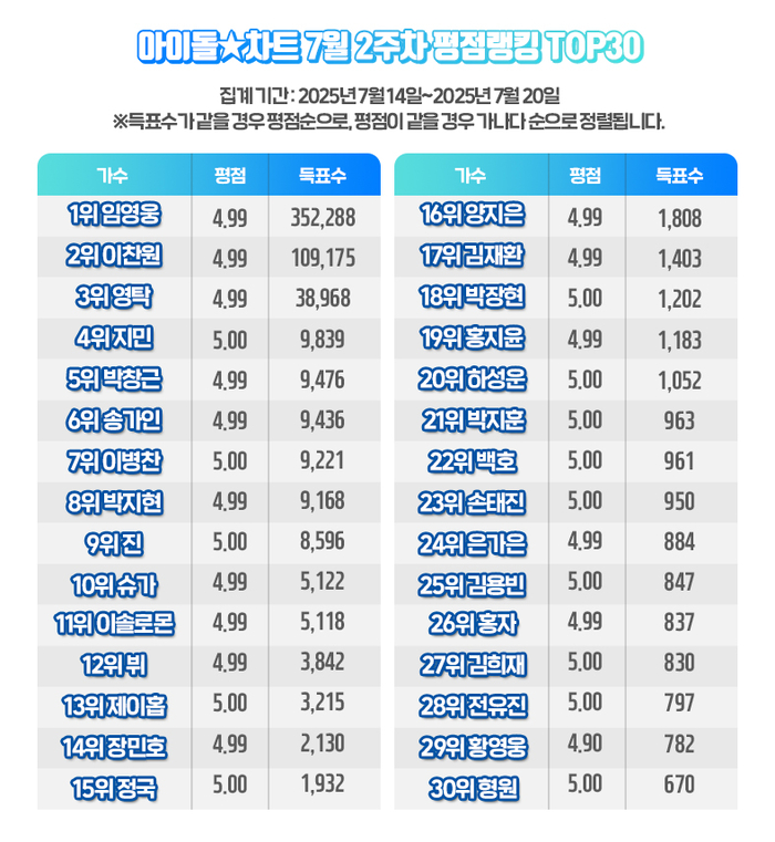 임영웅,아이돌차트평점랭킹225주연속1위가수임영웅이7월2주차아이돌차트평점랭킹에서최다득표자에올랐다.아이돌차트에따르면지난7월14일부터7월20일까지집계된평점랭킹에서임영웅은35만2288표를얻어최다득표를기록했다.이로써임영웅은아이돌차트평점랭킹에서225주연속1위에오르게됐다.2위는이찬원(10만9175표)이차지했다.이어영탁(3만8968표),지민(방탄소년단,9839표),박창근(9476표),송가인(9436표),이병찬(9221표),박지현(9168표),진(방탄소년단,8596표),슈가(방탄소년단,5122표)순으로집계됐다.스타에대한실질적인팬덤의규모를가늠할수있는‘좋아요’에서도임영웅은가장많은3만3635개를받았다.이어이찬원(1만321개),영탁(4153개),박지현(1356표),송가인(1065개),지민(997개),박창근(957개),이병찬(942표),진(885표),슈가(606개)순으로‘좋아요’수를기록했다.Copyright©스타투데이.무단전재,재배포및AI학습이용금지