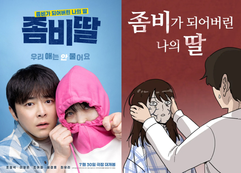 극장가보릿고개속에도어김없이여름성수기시장이다가왔습니다.상반기내내작품개봉에신중을기하던국내주요배급사들도아껴뒀던알짜배기작품들을하나둘내놓고있는데요.주요배급사별올여름극장가를책임질세편의영화를소개합니다.두번째영화는‘좀비딸’입니다.<편집자주>사진=NEW,네이버웹툰그야말로웹툰을찢었다.‘좀비딸’이만화요소를장르적매력으로살려‘영상화의정석’을노린다.오는30일개봉하는‘좀비딸’은이세상마지막남은좀비가된딸을지키기위해극비훈련에돌입한딸바보아빠의이야기를그린다.‘인질’‘운수오진날’을연출한필감성감독이메가폰을잡았다.지난2018년연재된동명의웹툰(이윤창작가)이원작으로,26부작애니메이션도제작돼2022년EBS에서방영됐다.연재종료후5년이흐른웹툰이지만여전히평점9.9점을유지하고있다.그말인즉슨원작팬덤의기대도상당하다는것.‘좀비딸’은높은비주얼싱크로율로원작팬들의관심도불러모으고있다.사진=NEW캐릭터개성을놓치지않은배우들의비주얼이먼저눈길을끈다.필감독이캐스팅주안점으로유연한장르소화력과‘그림체’를주요하게고려한덕이다.원작웹툰보단배우들끼리닮은결을맞췄고,분장을통해싱크로율을높인것에가깝다.주인공정환역조정석과그의좀비가된딸수아역최유리는얼굴형부터혈연을의심케한다는반응이따랐다.여기에최유리는실감나는좀비분장을소화했다.시야가혼탁한특수렌즈착용은물론,매회차두시간씩특수분장을거쳐푸른핏줄까지표현했다는설명이다.좀비가아님에도오랜시간분장을받아가장만화같은비주얼을완성한건이정은이다.극중수아의할머니이자정환의엄마인밤순역으로,원작특유의동글동글한헤어스타일을반영한통가발을썼다.‘좀비딸’영화스틸(위)과애니메이션(아래)(사진=NEW,EBS)물론영화만의해석과매력포인트도충실하다.좀비흉내를내서탈출한다거나물리고보니좀비가틀니를끼고있었다는식의원작이윤창작가특유의개그코드를맛깔나게살리는가운데,K팝이새로운웃음요소로녹아든다.원작보다표현범위가확장된만큼배우들의해석이핵심이됐다.이정은은“감독님이영화에풍요로운이야기를덧붙이면서밤순은‘K팝을즐기는할머니’가됐다”며“웹툰원작이다보니자칫만화적으로만보일까봐노인분장을해도표정이읽히지않는건피하고자했다”고연기주안점을밝혔다.최유리의좀비모션은맹수사육사인정환의딸답게반려동물의느낌을살리면서도,수아가지닌사랑스러움을녹였다는전언이다.‘좀비딸’은좀비가소재임에도가족드라마색이짙은따뜻한이야기인점이사랑받는요인으로꼽힌다.영화는이를살려기존좀비영화와다른컬러풀한파스텔톤화면을만들었다.채경선미술감독은“동화책을넘기는느낌”을염두했다고밝혔다.마루에서바닷가가직접보이는은봉리집은이를충족하는집을찾다가세트장을새로지었다.사진=NEW제공사진=NEW제공사실만화적표현을그대로현실에옮겼을때몰입이저해되는경우도있다.그래서총천연색가발까지구현하는일본만화실사화와는달리,국내영상화작품은현실에발붙이는‘리얼리티’를획득하고자비주얼을변경하는경우가많다.그러나‘좀비딸’은가장구현이어려울캐릭터조차실사로구현했다.원작의마스코트인반려묘애용이다.CG로표현하는대신실사촬영원칙으로실제고양이를캐스팅해배우들과통일감을만들었다.이처럼리얼함과만화실사화감각을동시에살려보는재미를높인‘좀비딸’은관객들에게설득되는신선함을선사할전망이다.이주인기자[email protected]©일간스포츠.무단전재및재배포금지.