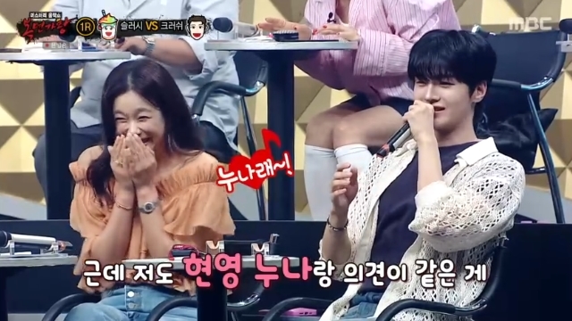 MBC‘복면가왕’캡처MBC‘복면가왕’캡처[뉴스엔서유나기자]방송인현영이드리핀차준호의누나호칭에입을틀어막으며좋아했다.7월20일방송된MBC예능'복면가왕'504회에서는가왕'앤틱거울'의5연승을막기위해출격한복면가수들의듀엣곡대결이펼쳐졌다.이날슬러시와크러쉬의듀엣무대를본현영은"슬러시님은외모만봐서는20대인줄알았다.팔뚝에집안일한흔적이하나도없고종아리도많이안걸은것같고.그런데막상노래를시작하니사실30대의성숙미가느껴졌다"고평했다.하지만곳곳에서반박이나왔다.슬러시의목소리가오히려"아기같지않냐"는주변반응에당황한현영은"제가의견이많이다르네요"라고순순히인정했다.이런현영에옆자리드리핀차준호는포복절도했다.김성주가"웃다쓰러지겠다"며걱정할정도.현영은차준호언급이나오자마자아랑곳하지않고"너무잘생겼어"라고칭찬하더니,차준호가"저도현영누나랑의견이같다"며본인을누나라고부르자입을틀어막고설레해웃음을자아냈다.한편드리핀차준호는2002년7월생으로만23세다.현영은1976년9월생으로만48세다.뉴스엔서유나stranger77@기사제보및보도자료[email protected]ⓒ뉴스엔.무단전재&재배포금지Copyright©뉴스엔.무단전재및재배포금지.