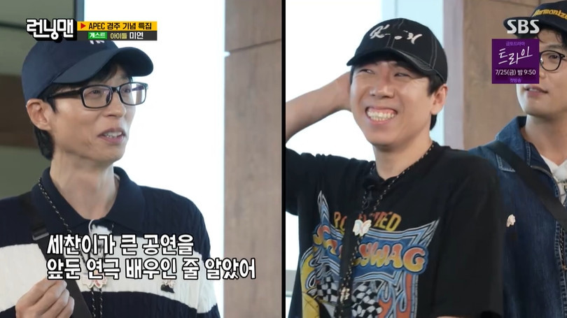 SBS‘런닝맨’캡처SBS‘런닝맨’캡처[뉴스엔장예솔기자]개그맨유재석이양세찬의대배우면모를폭로했다.7월20일방송된SBS'런닝맨'은'쪼개는승부사'레이스로꾸며진가운데아이들미연이게스트로출연했다.이날멤버들은20년만에열리는APEC정상회의의성공적인개최를기원하며경주를찾았다.남자멤버들과함께기차를타고경주에도착했다는유재석은"세찬이가큰공연을앞둔연극배우인줄알았다.도착하기30분전에조그만거울을놓더니분칠을시작하더라.대배우다"고폭로했다.하하는"쟤가메이크업할때약간화나보인다"며분노의퍼프질을하는양세찬을따라했다.이에양세찬은"시청자분들의편안한저녁시간을위해두드려야한다"고받아쳐웃음을자아냈다.뉴스엔장예솔imyesol@기사제보및보도자료[email protected]ⓒ뉴스엔.무단전재&재배포금지Copyright©뉴스엔.무단전재및재배포금지.