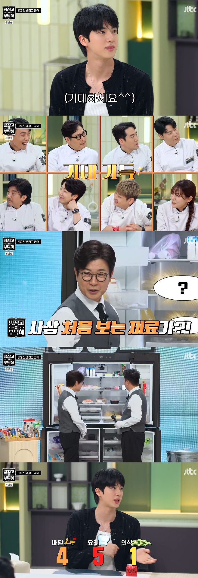 JTBC'냉장고를부탁해시즌2'20일방송JTBC'냉장고를부탁해시즌2'20일방송(서울=뉴스1)김보기자=방탄소년단(BTS)진이집에서요리를즐겨한다고말했다.20일오후방송된JTBC'냉장고를부탁해시즌2'에는BTS진이출연해재미를더했다.이날진의냉장고를살펴보자다양한식재료가나왔다.그중시판김치가나오자김성주는"김치를주로사서드시냐"고물었다.그러자진은"김치는원래친구들이랑김장을한다,스케줄에여유가있으면가끔씩연초에김장을하는데요즘은바빠서김치를산것"이라고말했다.안정환이"스케줄이안바쁘면음식을간혹해드시냐?"고묻자진은"저는음식을자주해먹는다"고말하더니"배달비율을따지자면4정도가배달,5정도가요리,1정도가나가서먹는다"라고구체적인비율을밝혔다.이에최현석은"그정도면엄청많이해드시는것"이라고말했다[email protected]©뉴스1.Allrightsreserved.무단전재및재배포,AI학습이용금지.
