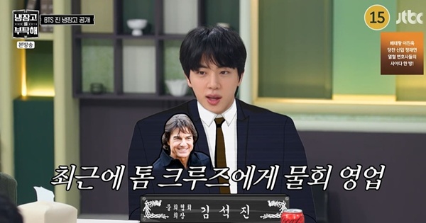 냉부해진/사진=JTBC캡처[스포츠투데이임시령기자]'냉장고를부탁해'진이물회홍보대사임을고백했다.20일방송된JTBC예능'냉장고를부탁해'에서는방탄소년단진이게스트로출연했다.이날냉장고안에서모둠회가등장하자셰프들은흥미를보였다.진은"항상있는건아니지만냉장고가너무비어있어배달시킨거다.초밥,물회를너무좋아한다"며"어제저녁에도물회를먹고왔다.일주일에세번은먹는다"고말했다.진은"물회협회도제가만들었다.많은분들에게물회를알리고다녀셔물회홍보협회회장이다.최근에는톰크루즈에게물회를추천했다"고남다른물회사랑을드러냈다.이어"인증영상도보내줬다.협회들어오고싶은연락달라"고너스레를떨었다.조세호가관심을보이자진은"입회비가있다.형님은백만원"이라고해웃음을안겼다.그러면서진은"초밥도집에서해먹는다.회는배달을시키고밥을만들어서초밥을"이라고얘기했다.또한"제가성공을해서2주에한번킹크랩을사먹는다"고솔직히말했다.[스포츠투데이임시령기자[email protected]]Copyright©스포츠투데이.무단전재및재배포금지.