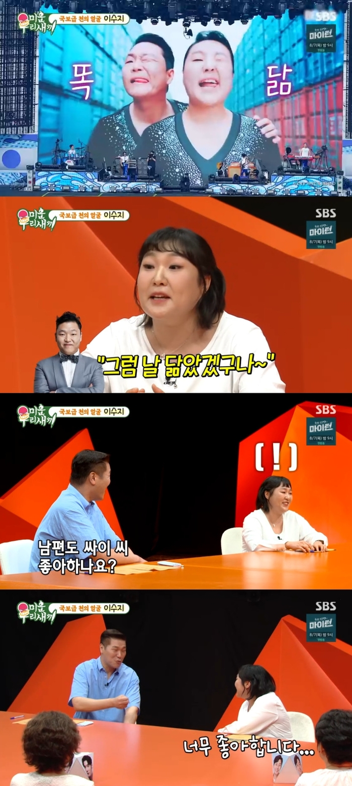 ‘미운우리새끼’사진|SBS이수지가남편도싸이를좋아한다고밝혔다.20일오후방송된SBS예능프로그램‘미운우리새끼’(이하‘미우새’)에는이수지가게스트로출연했다.이날방송에서이수지는흠뻑쇼출연비하인드를밝혔다.이수지는“싸이형님이콘서트영상찍자고전화했는데제가육아하느라못받았어요.그러고나서제가다시전화했는데싸이형님이‘아이가아들이니딸이니?아들이면날닮았겠구나’라고했어요”라고말해웃음을자아냈다.이어“싸이형님옷을입었는데바지가작은거예요.역시연예인은보기보다왜소하다는걸다시한번느꼈어요”라고덧붙였다.이를듣던서장훈이남편도싸이를좋아하냐고묻자이수지는“너무좋아합니다”라며어이없다는듯이웃었다.일요일오후9시5분SBS에서방송된다.[서예지스타투데이객원기자]Copyright©스타투데이.무단전재,재배포및AI학습이용금지