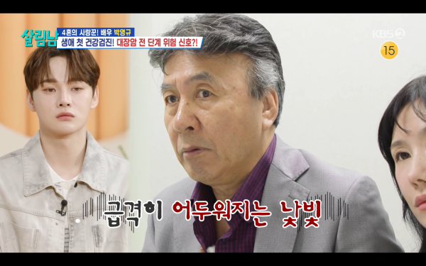 ⓒKBS2'살림하는남자들시즌2'[스포츠한국신영선기자]박영규가암전단계진단을받아모두를깜짝놀라게했다.19일방송된KBS2'살림하는남자들시즌2'(이하'살림남')에서박영규가25세연하아내와함께73년만에처음으로건강검진에나섰다.ⓒKBS2'살림하는남자들시즌2'의사는대장내시경결과를보며"거의10년만에검진이라고하셨죠?그나마천만다행인것같다.문제가좀있다"면서"대장내시경처음이지않나.6mm정도크기의대장용종이있다.암전단계인선종전단계가높아보인다.2~3년방치했으면대장암으로넘어갈수도있는데다행이다"고말했다.이어의사는"조직검사를보냈다.암전단계인선종으로나오면다시한번확인을해야한다"고진단했다.스포츠한국신영선기자[email protected]©스포츠한국.무단전재및재배포금지.