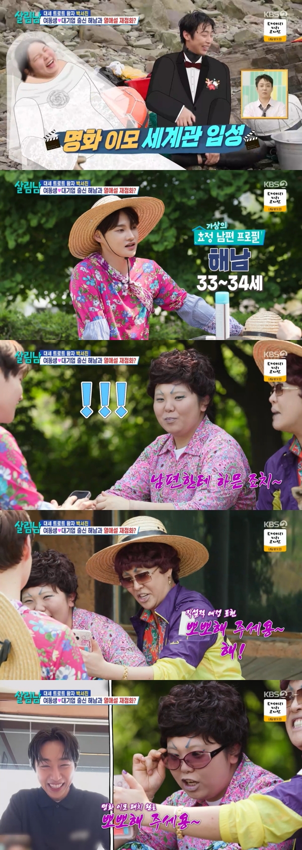 사진=KBS2[스포츠투데이김태형기자]가수박서진여동생이대기업출신해남에게영상통화로애교를부리며예능감을뽐냈다.19일방송된KBS2'살림하는남자들시즌2'에는박서진,박효정남매가랄랄의부캐이명화를만난모습이그려졌다.이날효정은콘서트와행사로바빴던박서진을위해여름휴가겸촌캉스를준비했다.이명화가깜짝등장한가운데,박서진은이명화의팬이라고밝혔다.박서진은이명화에게박효정의화장을부탁했다.이명화가"나처럼화장하면남자들다넘어와서난리난다"고하자,박서진은"꼬실남자가있다"고말했다.이명화가박효정이결혼하냐고재차묻자박서진은"결혼할거다.결혼해야된다"고답했다.그럼에도박효정은가만히있어눈길을끌었다.이명화는가발,선글라스까지준비해효정을완벽하게꾸며줬다.이에박서진은박효정과러브라인을이뤘던대기업출신해남에게영상통화를걸었다.이명화는"아이고멋지다.아니내가와이프화장야시롭게예쁘게해줬어요.'여보뽀뽀해주세요'해.그냥이렇게하면돼"라고시범을보였다.박효정은이명화의말투를따라하며애교를부렸다.그러자해남은"예뻐요예뻐요"라고반응했고,이명화는"네가제일나쁜놈이야"라며전화를끊어버려웃음을안겼다.[스포츠투데이김태형기자[email protected]]Copyright©스포츠투데이.무단전재및재배포금지.