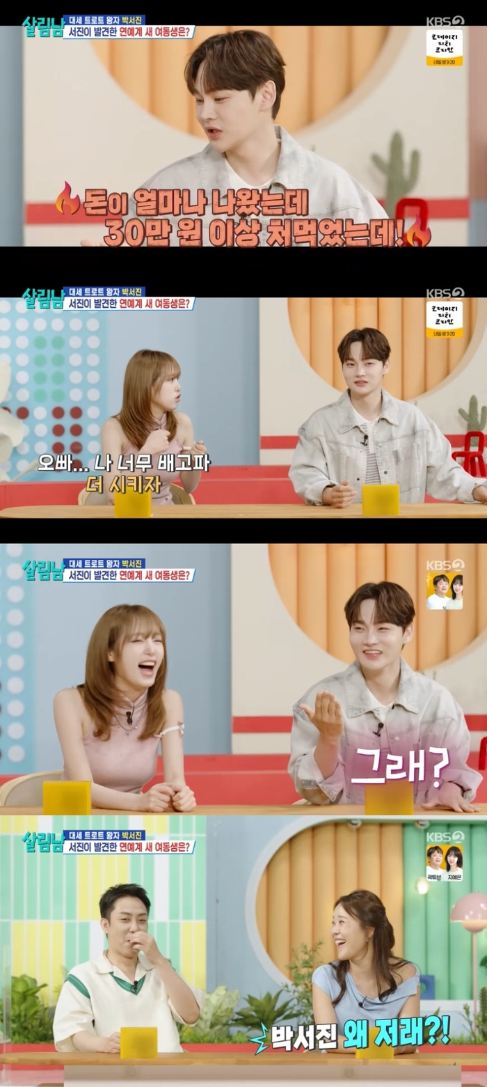 ‘살림남’.사진lKBS박서진이최예나애교에무너졌다.19일오후방송된KBS2‘살림하는남자들시즌2’(이하‘살림남’)에는최예나가게스트로출연했다.이날방송에서박서진과평행이론이있다며“저도4살터울오빠가있어요.선배님도4살터울이시고제가효정씨랑동갑이거든요”라고했다.이어“제방에오빠가오는걸싫어하는데제침대에서자고있고그래요”라고덧붙였다.이를보던백지영과은지원이공통점이많이보인다며상황극을제안했다.동생예나가양푼비빔밥을2그릇먹었는데음식을더먹자고하는상황.예나가“오빠나너무배고파더시키자”라고하자서진은“돌아이아이가?30만원이상처먹었는데”라고돌직구를날렸다.그러나예나가“너무배고픈데어떡해...”라며애교섞인눈빛을보이자서진은“그래?”라며사르르녹았다.‘살림남’은매주토요일오후9시15분에방송한다.[서예지스타투데이객원기자]Copyright©스타투데이.무단전재,재배포및AI학습이용금지