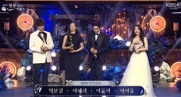 ⓒKBS2'청룡시리즈어워즈'[스포츠한국김현희기자]배우이준영이이름을잘못들이준혁대신무대에올라가는헤프닝이벌어졌다.19일오후인천파라다이스시티에서제4회청룡시리즈어워즈가개최됐다.이행사에는전현무와임윤아가진행을맡았다.이날행사에는업비트인기스타상시상이진행됐고,이상에는박보검,혜리,이준혁,아이유가호명됐다.이때이준영이이름을잘못들어이준혁대신무대에올랐다가자신의이름이아닌것을알고,이준혁에게상을건넸다.이에이준혁은"제가일단팬분들게감사드리고,사실제가재밌는사람이라고동네방네떠들고다녔는데이런순간이생겨서좀재밌는사람이된것같다.언젠가상을받는순간재밌는순간이있었으면좋겠다고생각했는데이렇게생겨서너무감사드린다"고유쾌한소감을전했다.ⓒKBS2'청룡시리즈어워즈'박보검은"팬들의투표와사랑덕분에이상을받게됐다.항상많은사랑주셔서너무감사하다.'폭싹속았수다'통해서많은분들에게인사드리고감동을드릴수있어서기쁘다.많은응원감사하다"고전했다.혜리는"인기스타라니너무감격스럽다.저인기상처음받는다.팬들이저를이자리에올리기위해매일노력하셨다.여러분의한표,한표,잊지않는스타되겠다.그리고'선의의경쟁'사랑해주셔서감사하다"고인사를전했다.아이유는"이인기상주셔서감사드리고,'폭싹속았수다'사랑해주셔서감사드리고,유애나감사드린다"고했다.한편청룡시리즈어워즈는국내최초의오리지널스트리밍콘텐츠시상식이다.넷플릭스,디즈니플러스,티빙,쿠팡플레이등주요OTT플랫폼의드라마·예능프로그램을대상으로한다.스포츠한국김현희기자[email protected]©스포츠한국.무단전재및재배포금지.