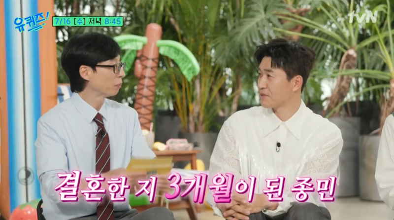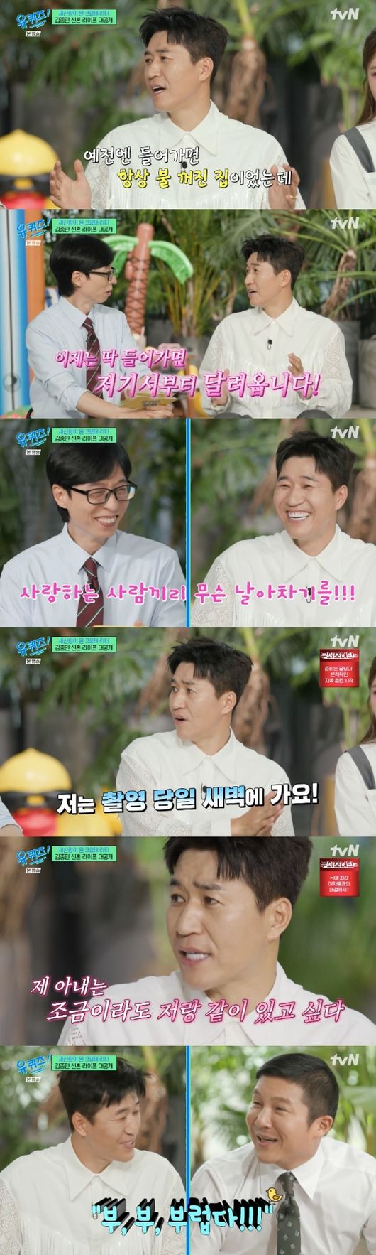 코요태김종민이결혼3개월차신혼일상을공개했다.16일방송된tvN예능‘유퀴즈온더블록’(이하‘유퀴즈’)302회에는27년차최장수혼성그룹코요태김종민,빽가,신지가게스트로출연했다.김종민은신혼생활관련질문에“너무좋다.예전에들어가면항상불꺼진집이었는데딱들어가면불켜져있고(아내가)저기서부터달려온다”고웃으며답했다.김종민의말에신지와유재석이짓궂게놀리자“(나에게)와서왔다고반겨줄때너무행복하다”고연신미소를보였다.또김종민은“(조)세호씨는‘1박2일’가기전에컨디션위해하루자고시작하는데저는새벽에간다.제아내는조금이라도저랑같이있고싶어한다”고말했다.한편김종민은지난4월20일서울중구신라호텔영빈관에서11살연하의비연예인사업가와결혼했다.박세연기자[email protected]©일간스포츠.무단전재및재배포금지.